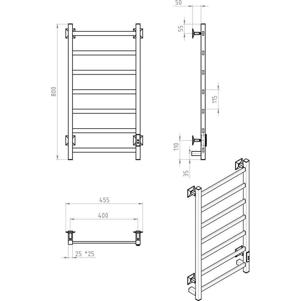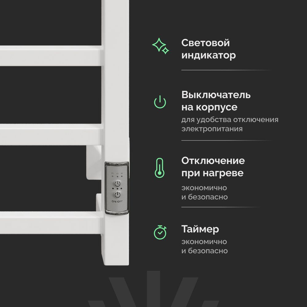 Полотенцесушитель имеет габариты 45,5x80 см и рассчитан на подключение к электрической сети через кабель с вилкой или скрытую проводку внутри стены. Мощность прибора составляет 100 Вт, что обеспечивает обогрев площади до 4,55 м². Удобное расположение подключения — как справа, так и слева, делает монтаж универсальным. Встроенный терморегулятор позволяет настроить комфортную температуру, а световой индикатор на корпусе сообщает о режиме работы.