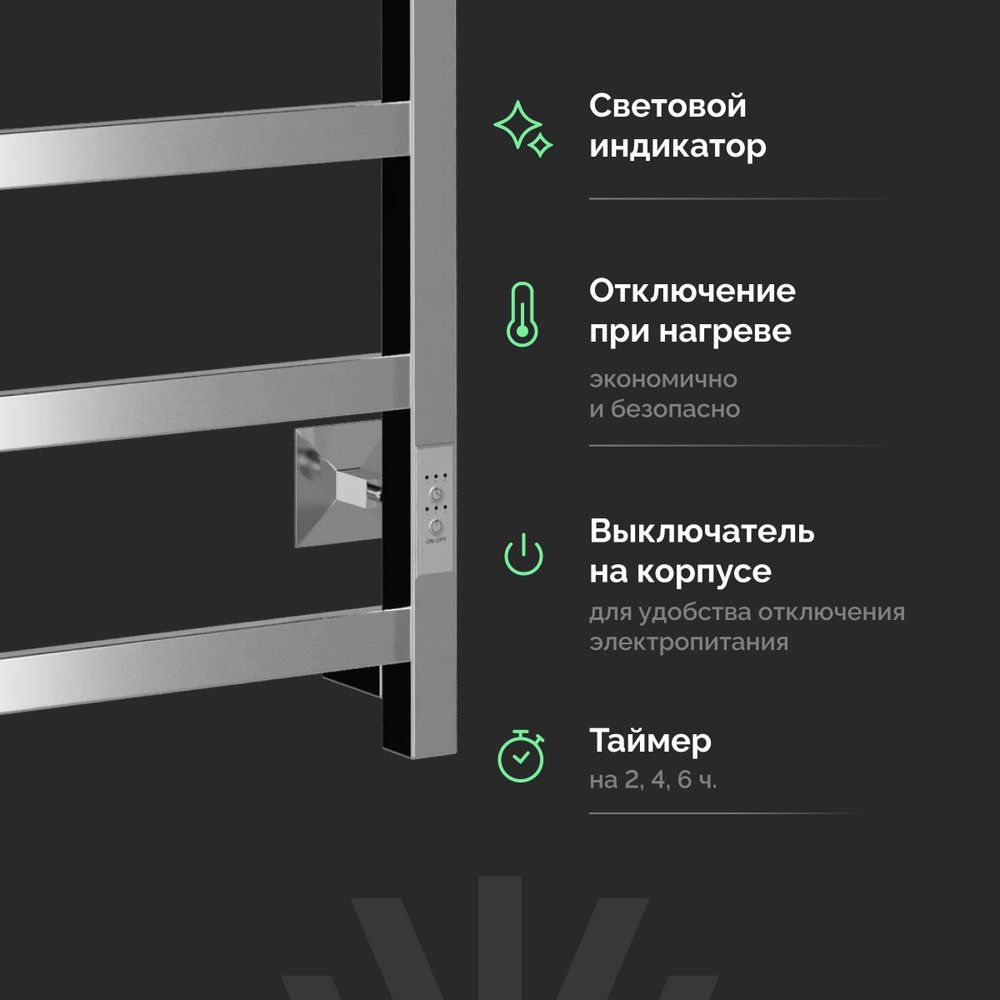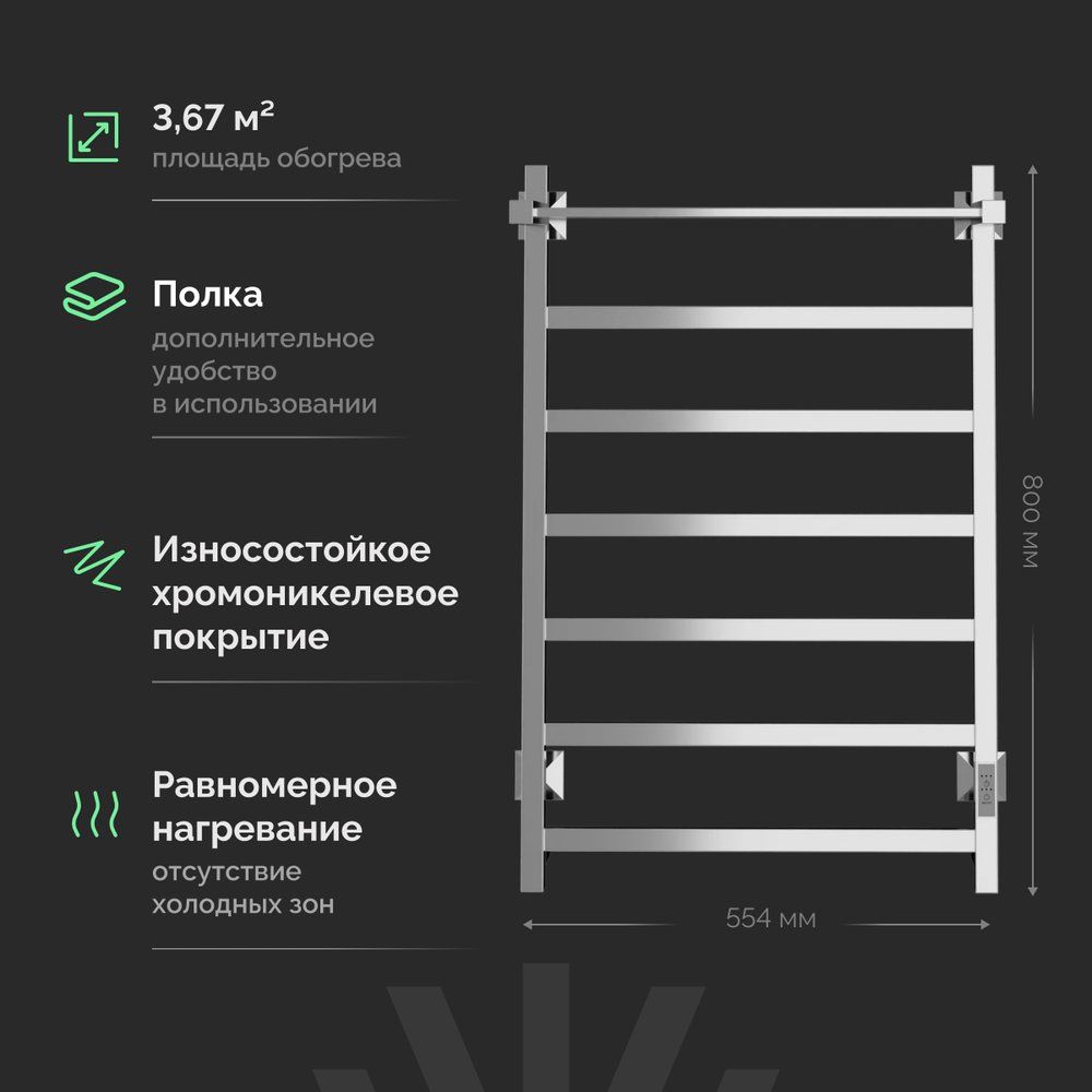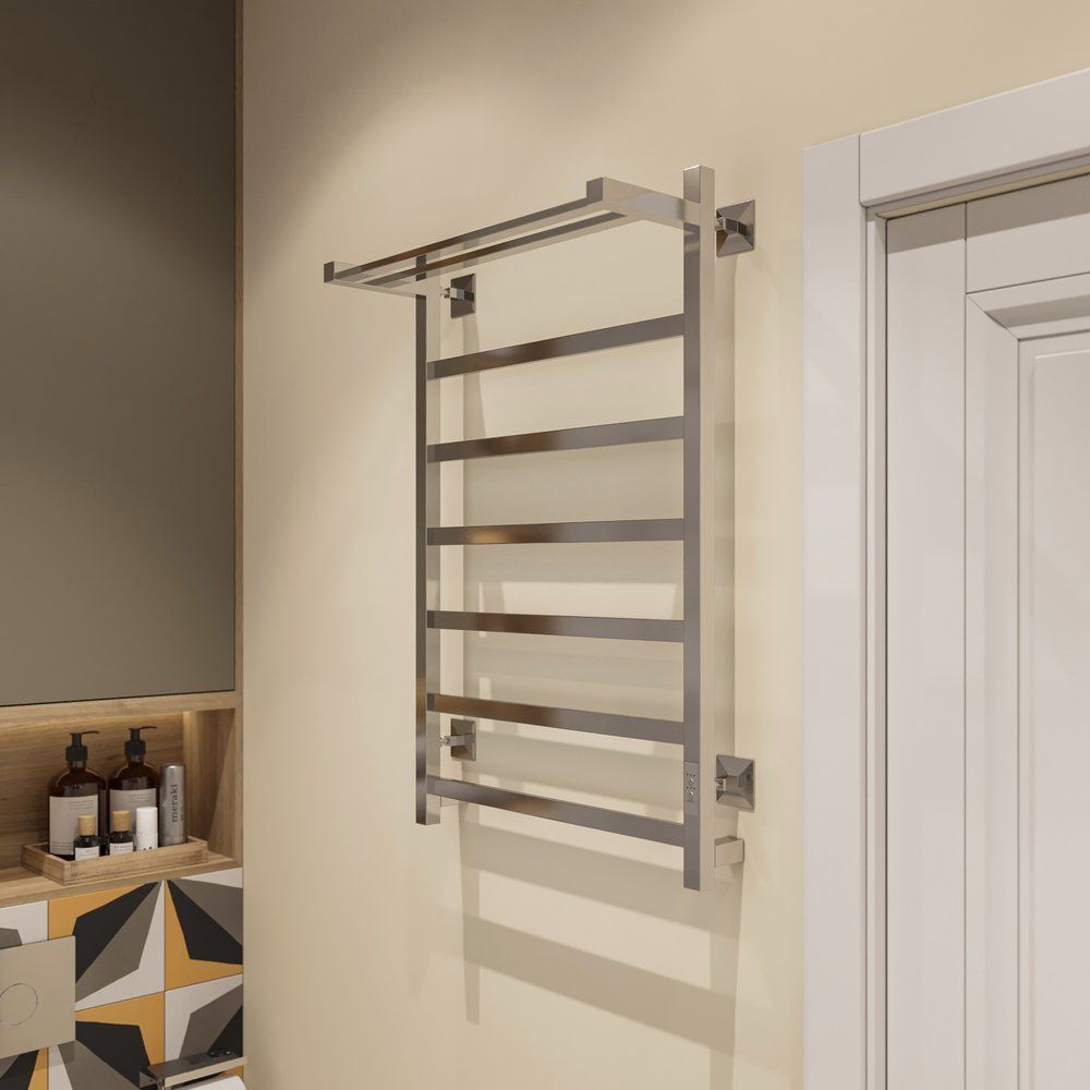 Полотенцесушитель электрический EWRIKA Пенелопа КВ7, 80х50, с полкой, хром — это идеальное решение для создания уюта и комфорта в вашей ванной комнате. Изготовленный из высококачественной нержавеющей стали AISI 201, этот полотенцесушитель отличается не только элегантным дизайном, но и надежной конструкцией. Вертикальные профильные трубы размером 25х25 мм и горизонтальные вставки из труб 25х10 мм обеспечивают равномерный и эффективный нагрев. Установленный внутри греющий кабель аналогичен системам «теплый пол» и поддерживает постоянную температуру от 50 до 60 градусов. Это делает продукт не только эстетически привлекательным, но и функциональным и долговечным.
