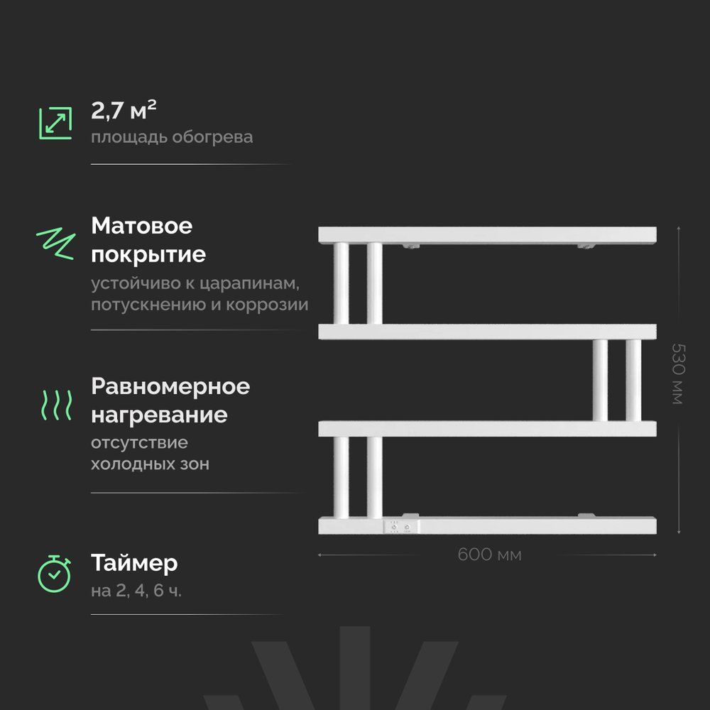 Полотенцесушитель EWRIKA Пенелопа M обладает мощностью 80 Вт и подключается к электрической сети через кабель с вилкой либо может быть скрыто вмонтирован в стену. Это удобный подвесной аксессуар, оснащённый выключателем на корпусе и встроенным терморегулятором для установки комфортной температуры. Опция отключения при нагреве способствует значительной экономии электроэнергии. Сухой нагревательный кабель находится внутри и обеспечивает равномерное распределение тепла на площадь обогрева 2.7 м2. Продукт изготовлен из качественной стали с электросварным швом и имеет возможность подключения как справа, так и слева. Наличие таймера позволит вам отключить прибор по окончании сушки. Гарантия на изделие составляет два года, что подтверждает надёжность товара отечественного производства.