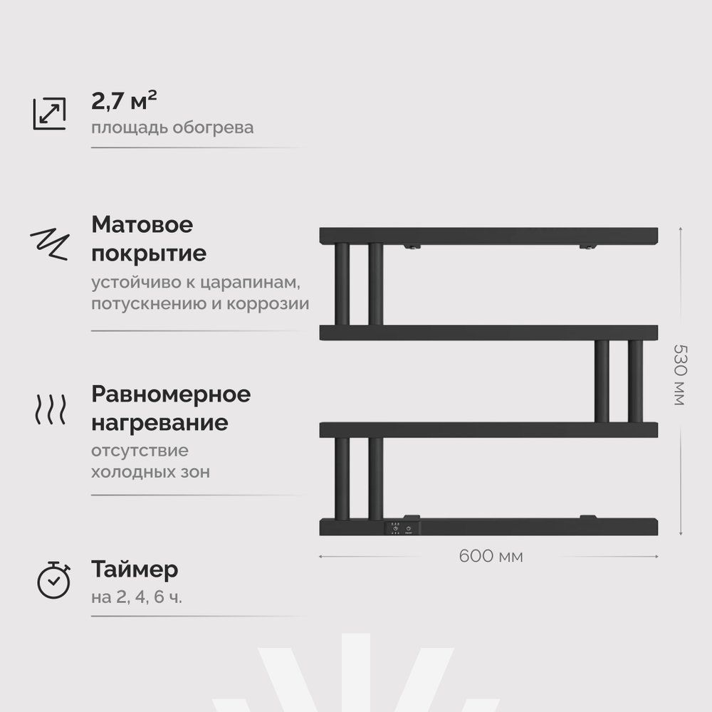 Электрический полотенцесушитель EWRIKA Пенелопа M мгновенно превращает вашу ванную в уютное пространства, обеспечивая комфорт и стиль. Благодаря своему современному дизайну в элегантном черном цвете, он идеально впишется в любой интерьер. За счет использования передовых технологий, модель предлагает надежность и функциональность, сочетая в себе эстетические и практические преимущества.