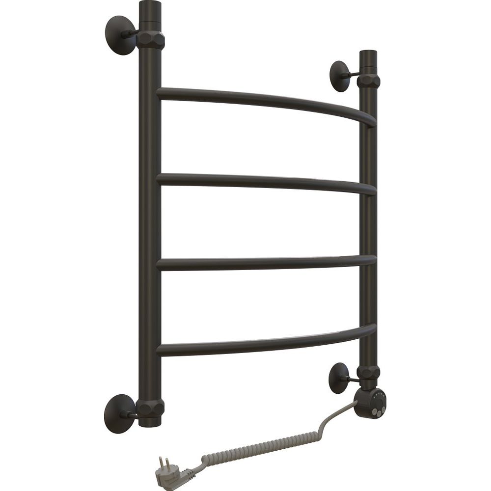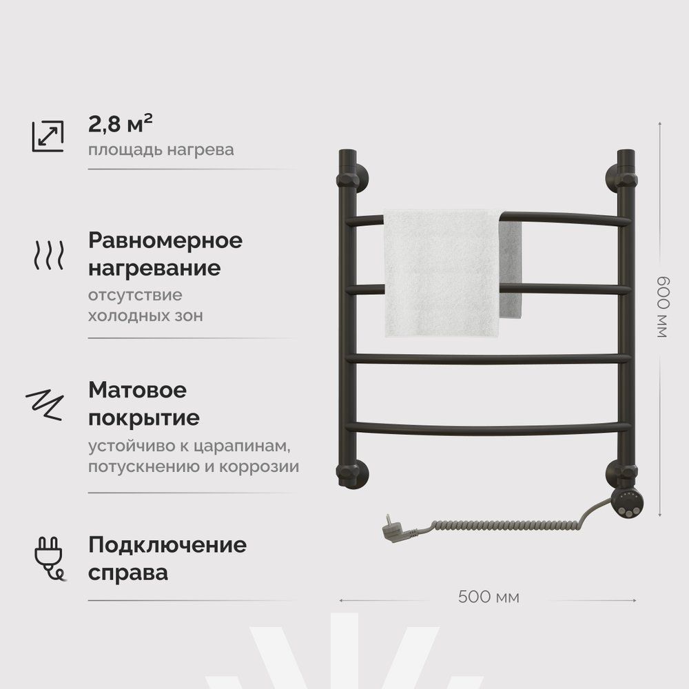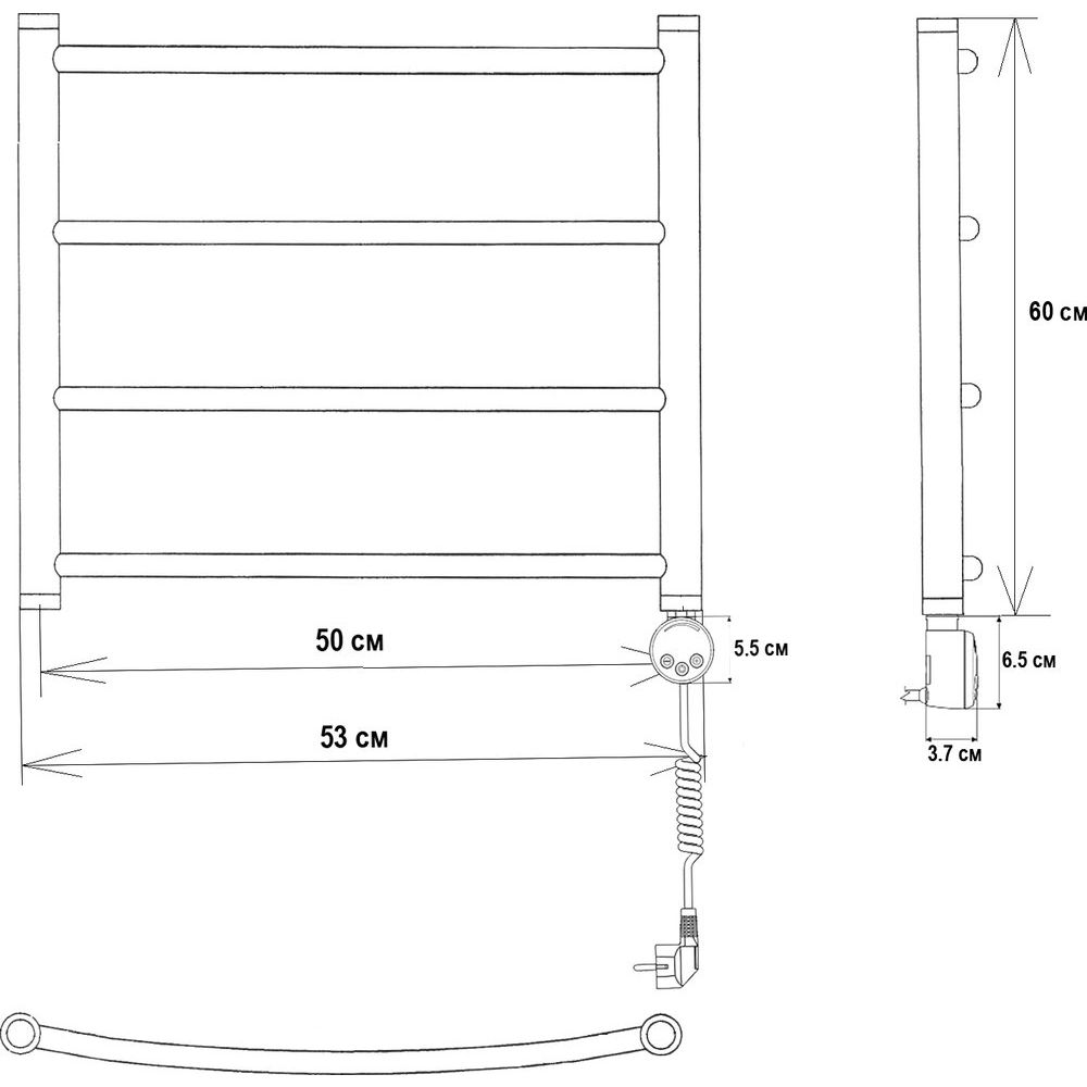 Габариты полотенцесушителя составляют 53x66,5 см, а мощность устройства — 300 Вт, что обеспечивает равномерный нагрев площади до 2.8 м². Подключение осуществляется через правую сторону с помощью кабеля с вилкой, что делает его удобным для установки в любой части ванной комнаты. Встроенный терморегулятор и датчик температуры воздуха позволяют точно регулировать уровень обогрева, а функция отключения при нагреве способствует экономии электроэнергии. Полотенцесушитель оснащён световым индикатором на корпусе и краном Маевского для удаления воздуха из системы.
