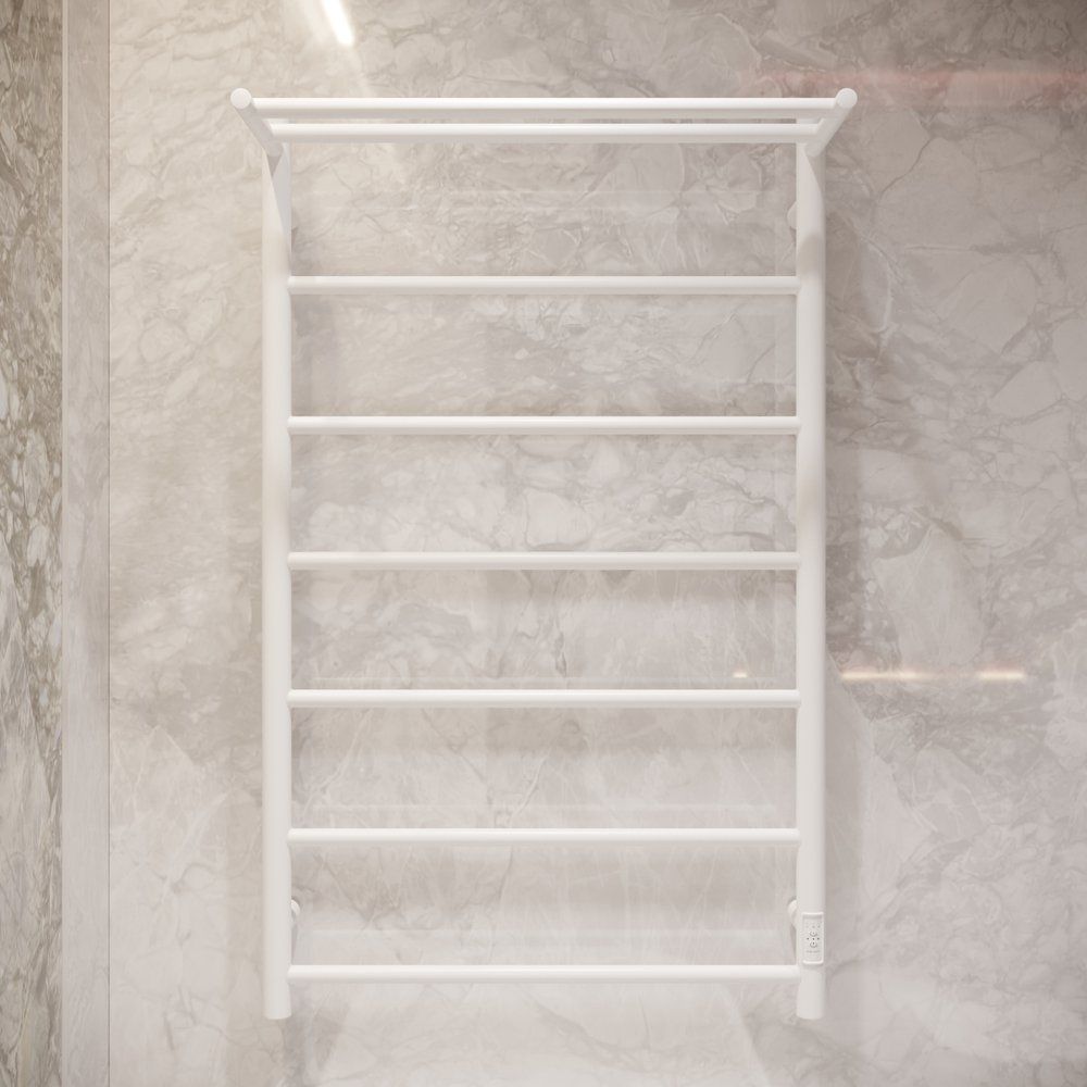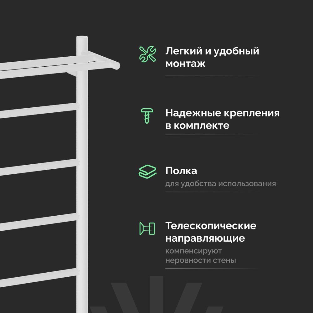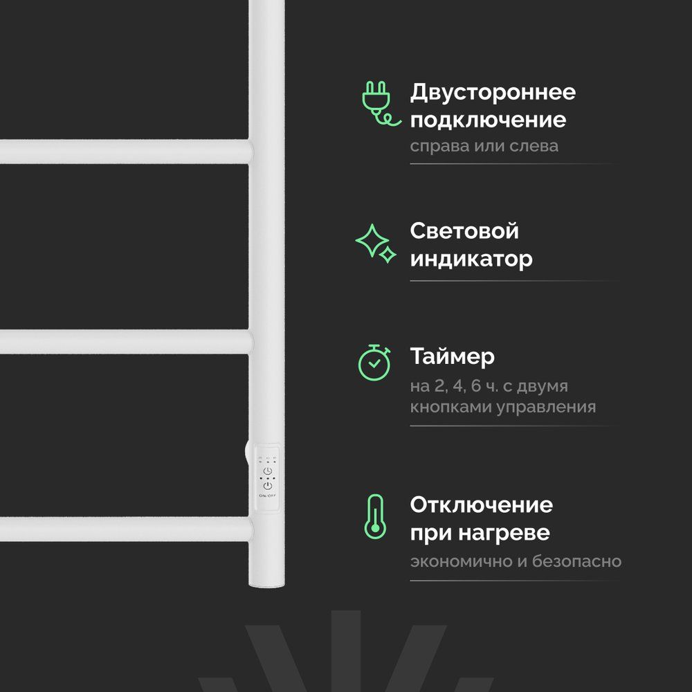Полотенцесушитель электрический EWRIKA Сафо PN 100х60, с полкой — это идеальное решение для вашей ванной комнаты, сочетающее в себе стильный дизайн и функциональность. Белый матовый цвет не только привлекателен, но и универсален, что позволяет устройству легко вписываться в любой интерьер. Этот полотенцесушитель не требует сложной установки и мгновенно подключается к электрической сети.