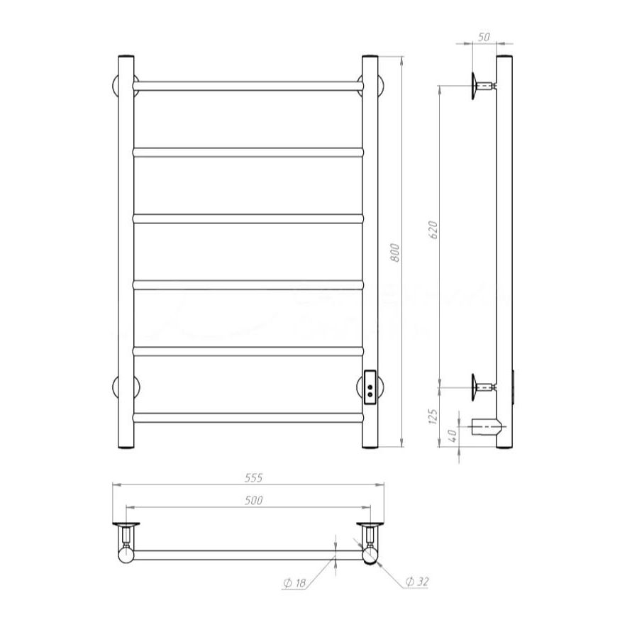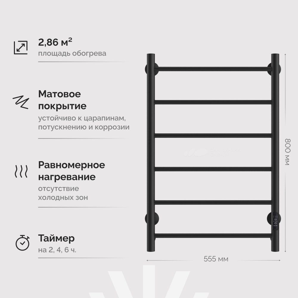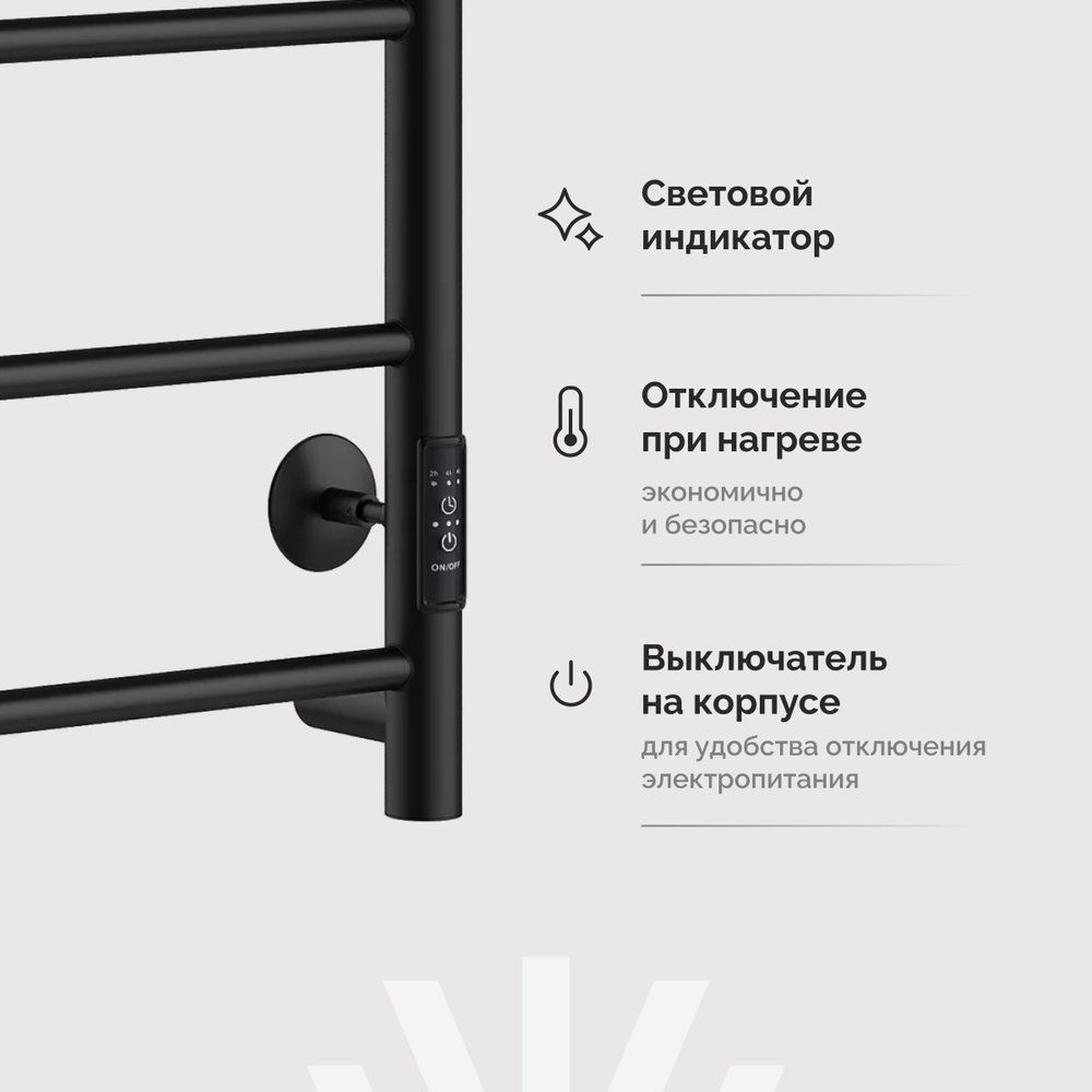 Полотенцесушитель оснащён световым индикатором на корпусе и имеет встроенный терморегулятор для настройки комфортной температуры. Габариты изделия составляют 55,5 см в ширину и 80 см в высоту, с мощностью в 60 Вт. Площадь обогрева — 2.86 м², что достаточно для стандартной ванной комнаты. Он подключается к электросети через кабель с вилкой или с скрытым подключением в стену.