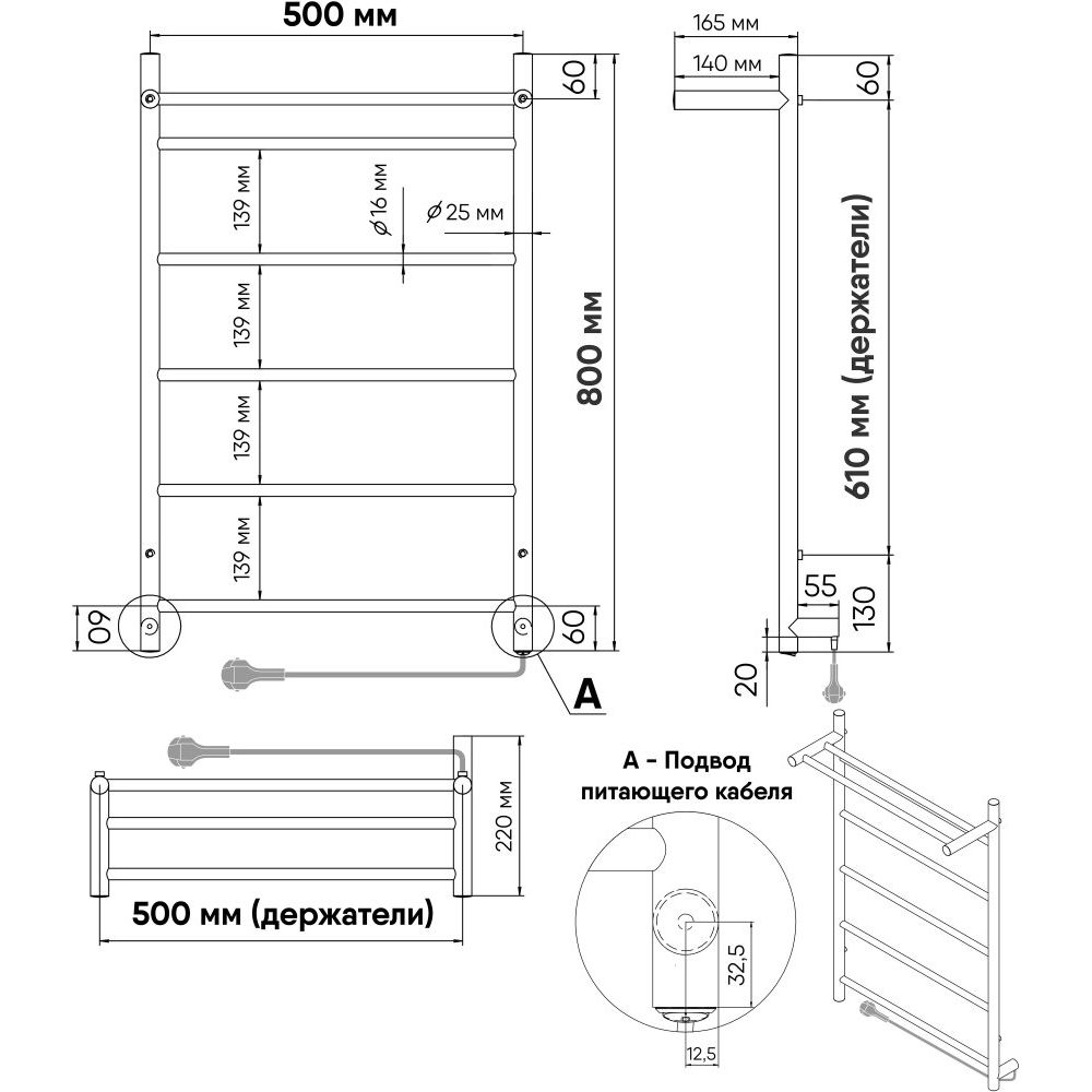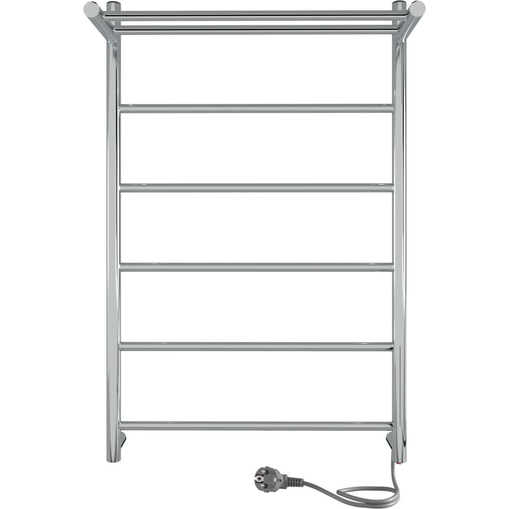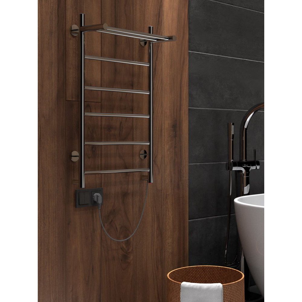 Полотенцесушитель имеет габариты 52.5x80 см и может подключаться к электрической сети как через кабель с вилкой, так и скрыто в стене. Модель оснащена нагревательным кабелем, который расположен внутри и обеспечивающим его работоспособность. Все элементы изготовлены из нержавеющей стали, включая электросварной шов. На корпусе находится отключаемый выключатель и световой индикатор работы, что делает использование прибора еще удобнее. Изделие подвесное, идет в комплекте с креплениями и электрическим кабелем.