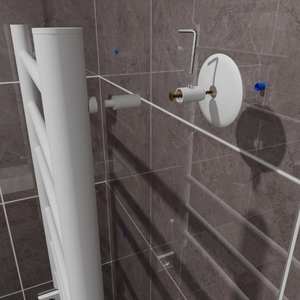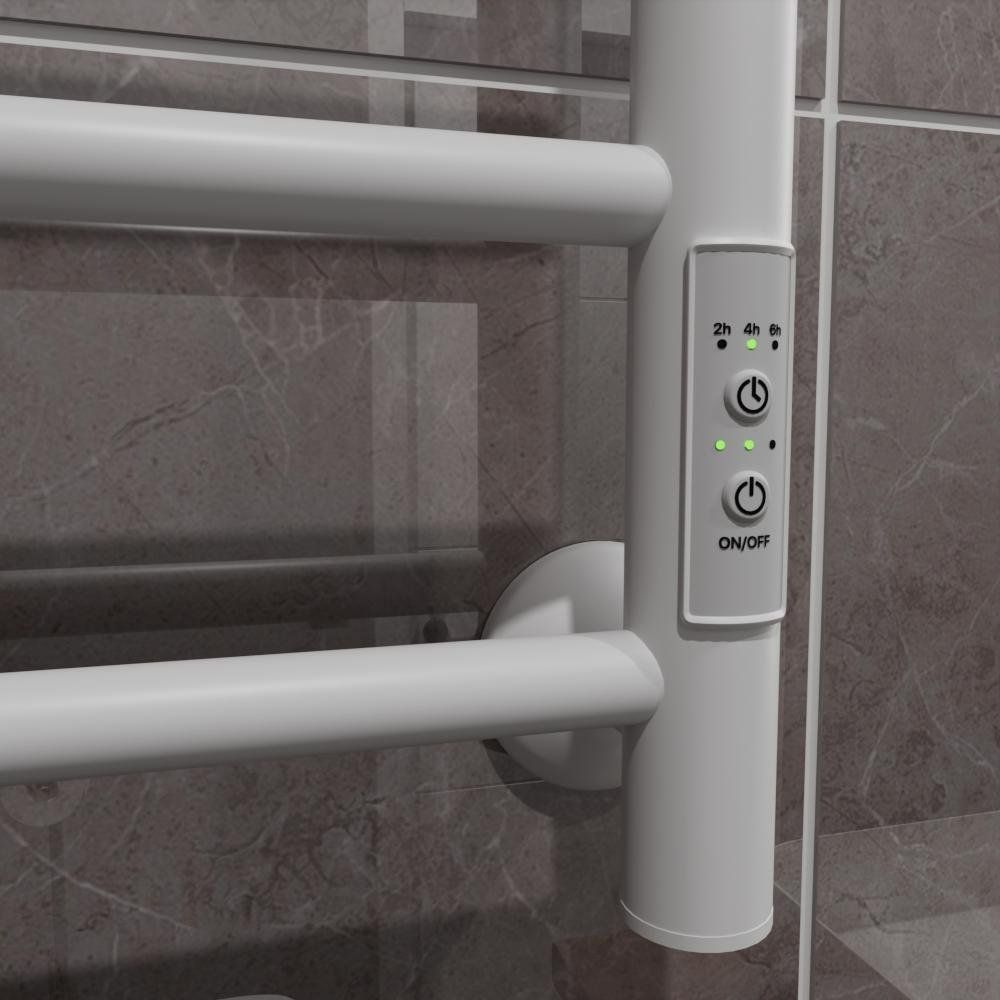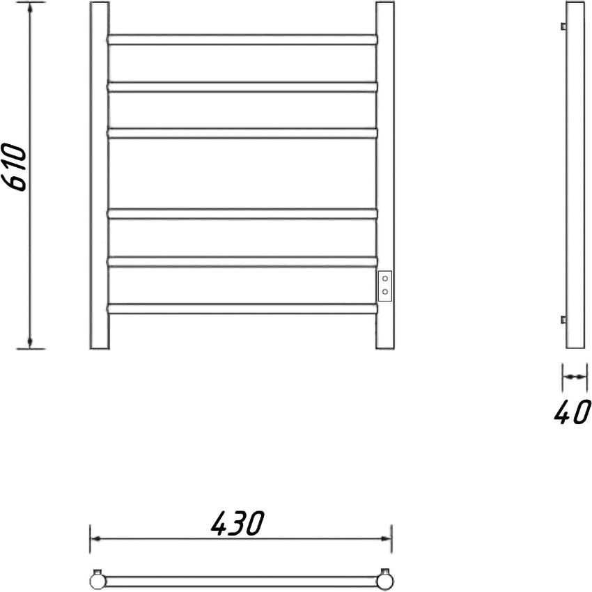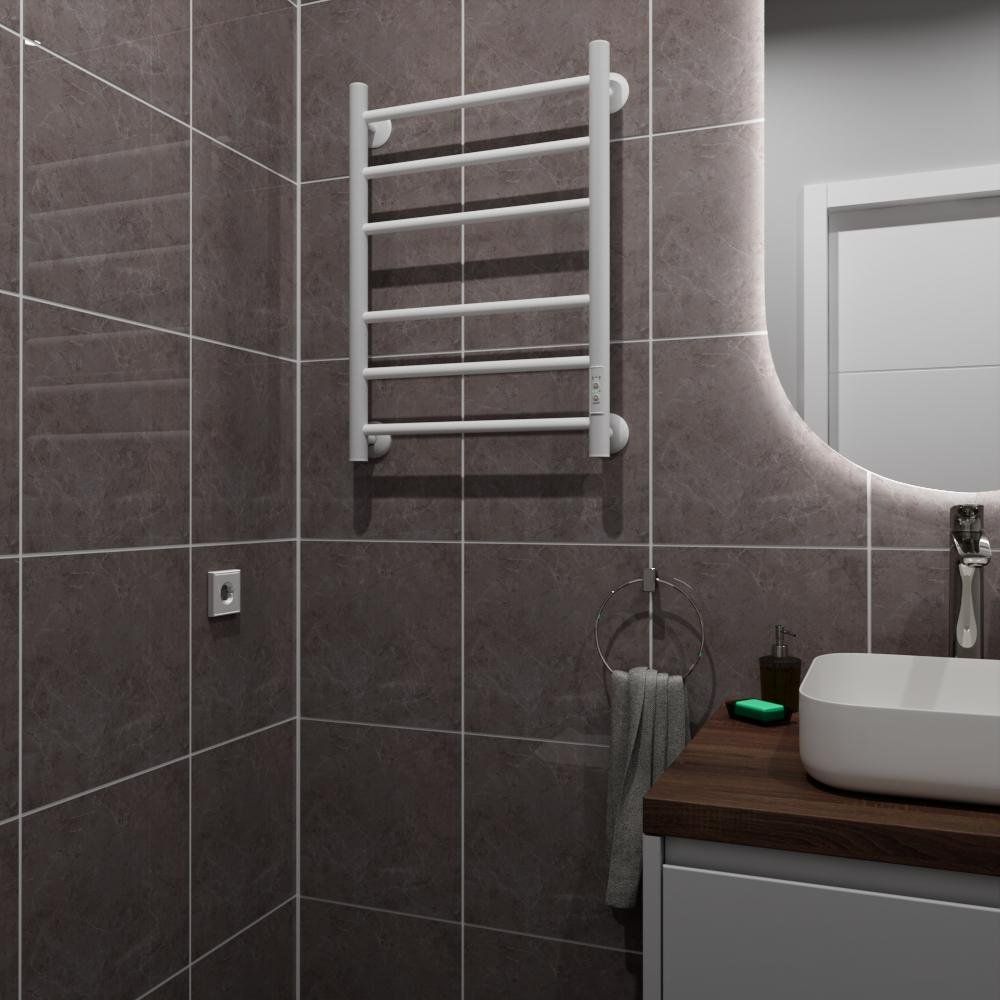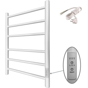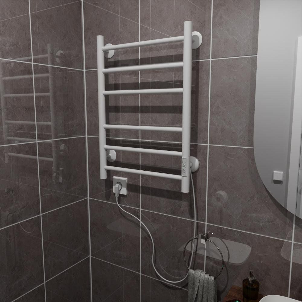 Полотенцесушитель имеет размеры 43x61 см и подключается к электрической сети через кабель с вилкой, мощностью 75 Вт. Он оснащён встроенным терморегулятором, позволяющим выбрать максимально комфортную температуру, и выключателем на корпусе для удобного отключения электропитания. Таймер отключения завершает процесс сушки, а функция автоматического отключения при нагреве экономит электроэнергию. Стальной подвесной полотенцесушитель использует трубу с электросварным швом и подключается справа.