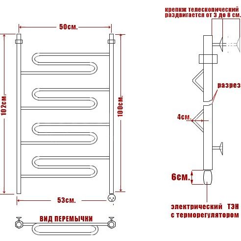 Технология сварки соответствует стандарту TIG — EN 10217-7, обеспечивая прочность и долговечность конструкции. Полотенцесушитель выполнен из труб с толщиной стенки 1,5 мм, основной труба имеет диаметр 25 мм, а перемычки — 18 мм. Теплоотдача устройства составляет 518 Вт, обеспечивая эффективное обогревание площади до 14 м². Габариты изделия составляют 53x106 см, и оно оснащено выключателем на корпусе для удобства управления. Подключение осуществляется через электрический кабель с вилкой, с расположением подключения слева. Полотенцесушитель подвесной, использует антифриз в качестве теплоносителя и имеет нагревательный ТЭН в нижней части.