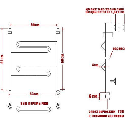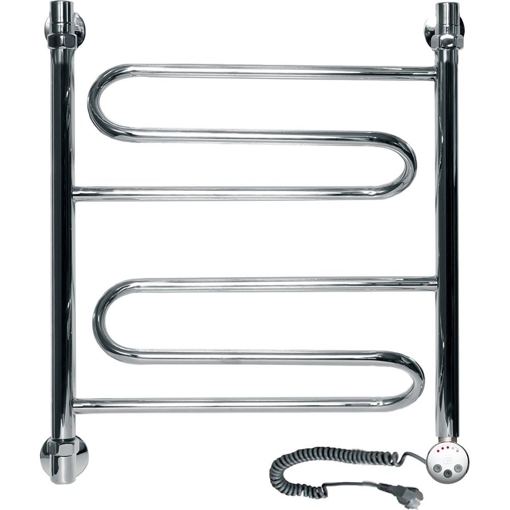 Полотенцесушитель имеет размеры 53x66 см и подключается к электрической сети через кабель с вилкой. Средняя мощность прибора составляет 300 Вт, что обеспечивает обогрев площади до 8 м2. Выключатель на корпусе делает отключение электропитания простым и безопасным, а встроенный терморегулятор позволяет настроить оптимальную температуру. Устройство изготовлено из нержавеющей стали с применением контактной сварки и имеет диаметр основной трубы 25 мм, а перемычки — 18 мм. Теплоотдача устройства составляет 277 Вт, что позволяет эффективно обогревать ванную комнату. Для безопасного и длительного использования в качестве теплоносителя применяется антифриз. Полотенцесушитель оснащен нагревательным ТЭНом, располагающимся в нижней части у подключения к электропитанию, и рассчитан на правостороннее подключение.