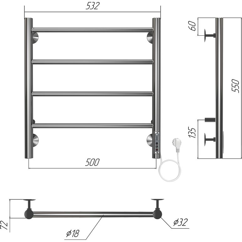 Полотенцесушитель Terminus Аврора П4 500х550 имеет габариты 53,2x55 см, что позволяет эффективно использовать его в ванной комнате любой площади. Он оснащен нагревательным кабелем сухого типа и поддерживает площадь обогрева до 1.5 м². Устройство выполнено из нержавеющей стали с применением трубы с электросварным швом, обеспечивающим высокую надежность конструкции.