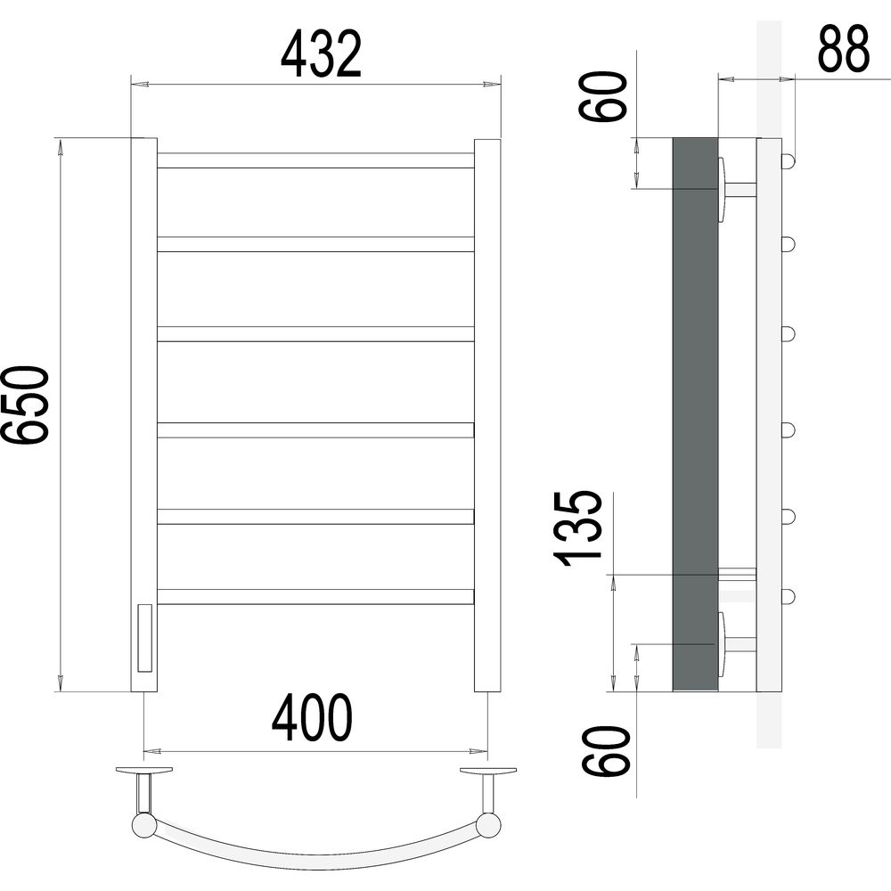 Полотенцесушитель Terminus имеет размеры 43,2x65 см и потребляет мощность 85 Вт. Подключение осуществляется слева, с возможностью скрытого монтажа в стену или через кабель с вилкой. Он оснащен световым индикатором и креплениями для удобного монтажа. Трубы с контактной сваркой обеспечивают долговечность, а встроенный нагревательный кабель и терморегулятор позволяют держать комфортную температуру. Продукция сопровождается гарантией производителя на 5 лет и производится в России.