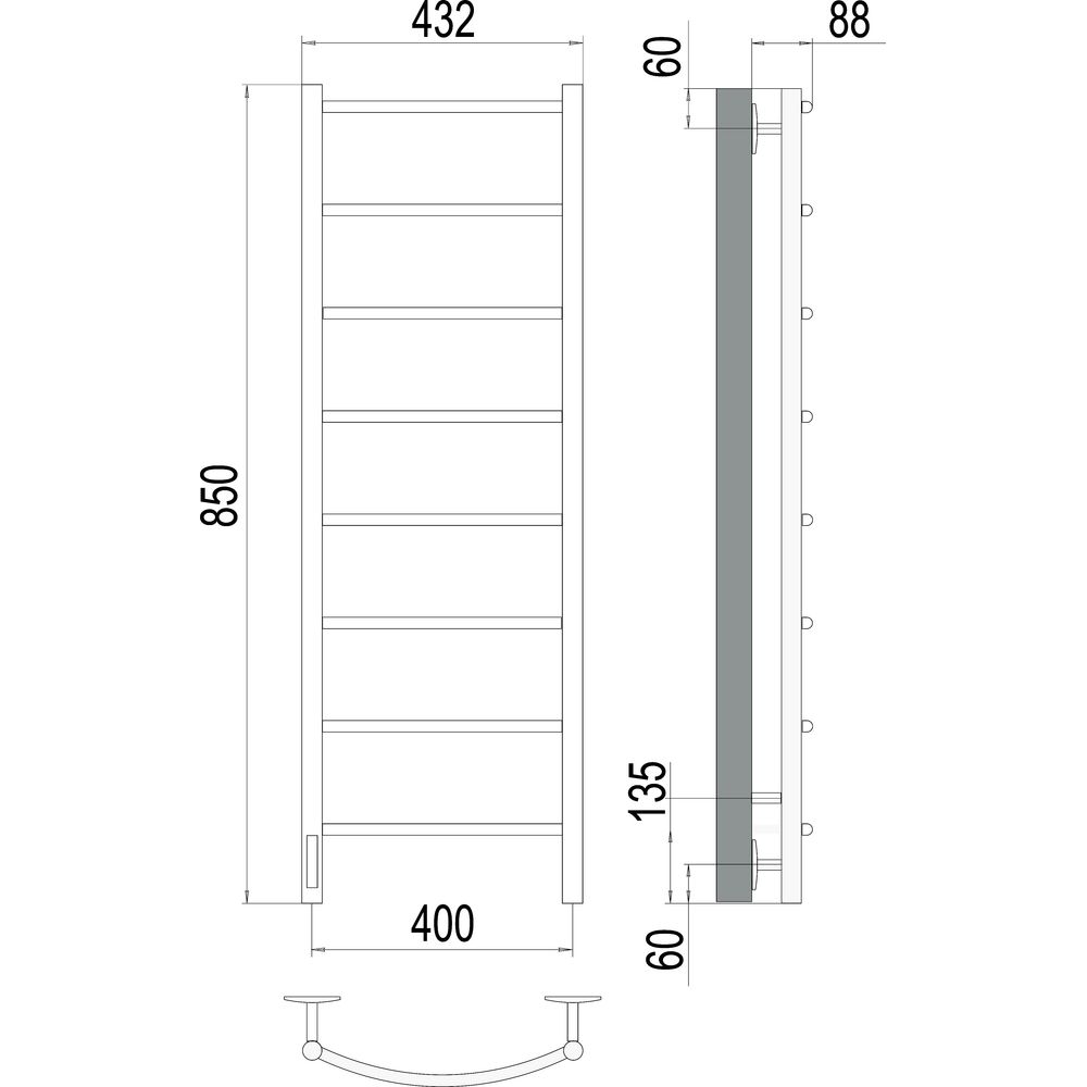 Полотенцесушитель имеет размеры 43,2x85 см и подключается к электрической сети, обеспечивая мощность в 110 Вт. Он оборудован выключателем на корпусе и световым индикатором для удобного управления. Конструкция предусматривает нагревательный кабель сухого типа, с площадью обогрева до 1.5 м². Возможность подвесного монтажа с левым подключением добавляет гибкости в установке. Изделие поставляется с гарантийным сроком в 5 лет и включает все необходимые крепления.