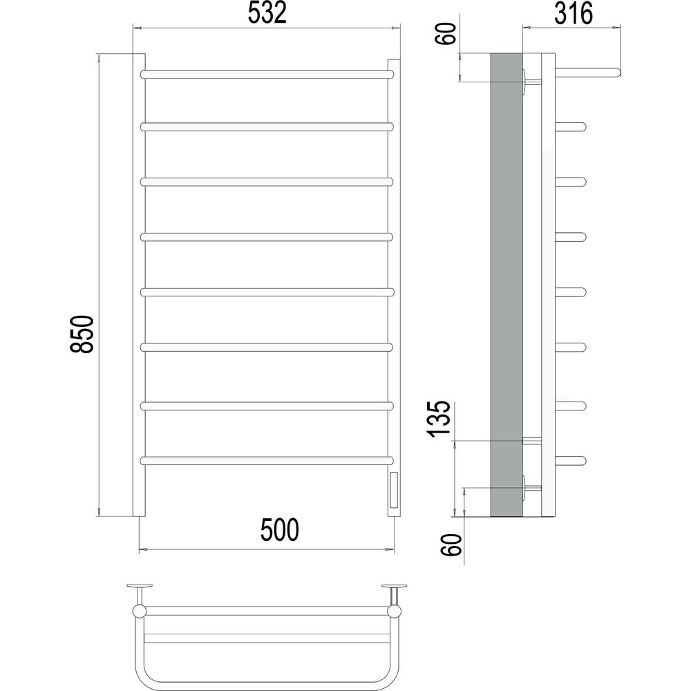 Полотенцесушитель Terminus Полка П8 имеет габариты 53,2x85 см, что позволяет обогревать площадь до 2 м². Устройство подключается к электросети и обладает мощностью 135 Вт. Удобное управление обеспечивается благодаря гиперрегулятору температуры и встроенному выключателю. Световой индикатор на корпусе дает возможность легко контролировать работу устройства. Прочный корпус из нержавеющей стали обеспечивает долговечность и надежность использования, а контактная сварка труб гарантирует надежность конструкции.