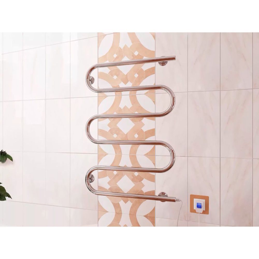 Полотенцесушитель электрический Terminus Ш-образный имеет размеры 50x82,5 см и мощность 95 Вт, обеспечивая обогрев площади до 2 м². Устройство подвесного типа подключается через электрическую сеть 220 В и оснащено кабелем с вилкой. Справа находится подключение, а нагревательный ТЭН расположен в нижней части для обеспечения равномерного распределения тепла. Материал изготовления — нержавеющая сталь с контактной сваркой, что повышает надежность конструкции.