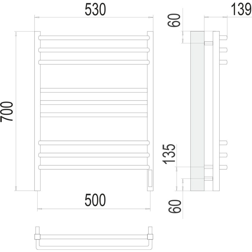 Полотенцесушитель имеет размеры 53x70 см, что делает его идеально подходящим для обогрева площади до 2 м2. Устройство мощностью 125 Вт оснащено встроенным терморегулятором, который позволяет легко регулировать температуру до максимально комфортной. Подключение располагается справа и может быть выполнено через кабель с вилкой или скрыто в стене, в зависимости от ваших предпочтений по установке. Полотенцесушитель изготовлен из высококачественной нержавеющей стали, что обеспечивает долгий срок службы и высокую устойчивость к коррозии. Эта модель монтируется на стену с использованием креплений, включенных в комплект.