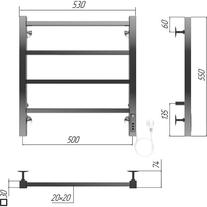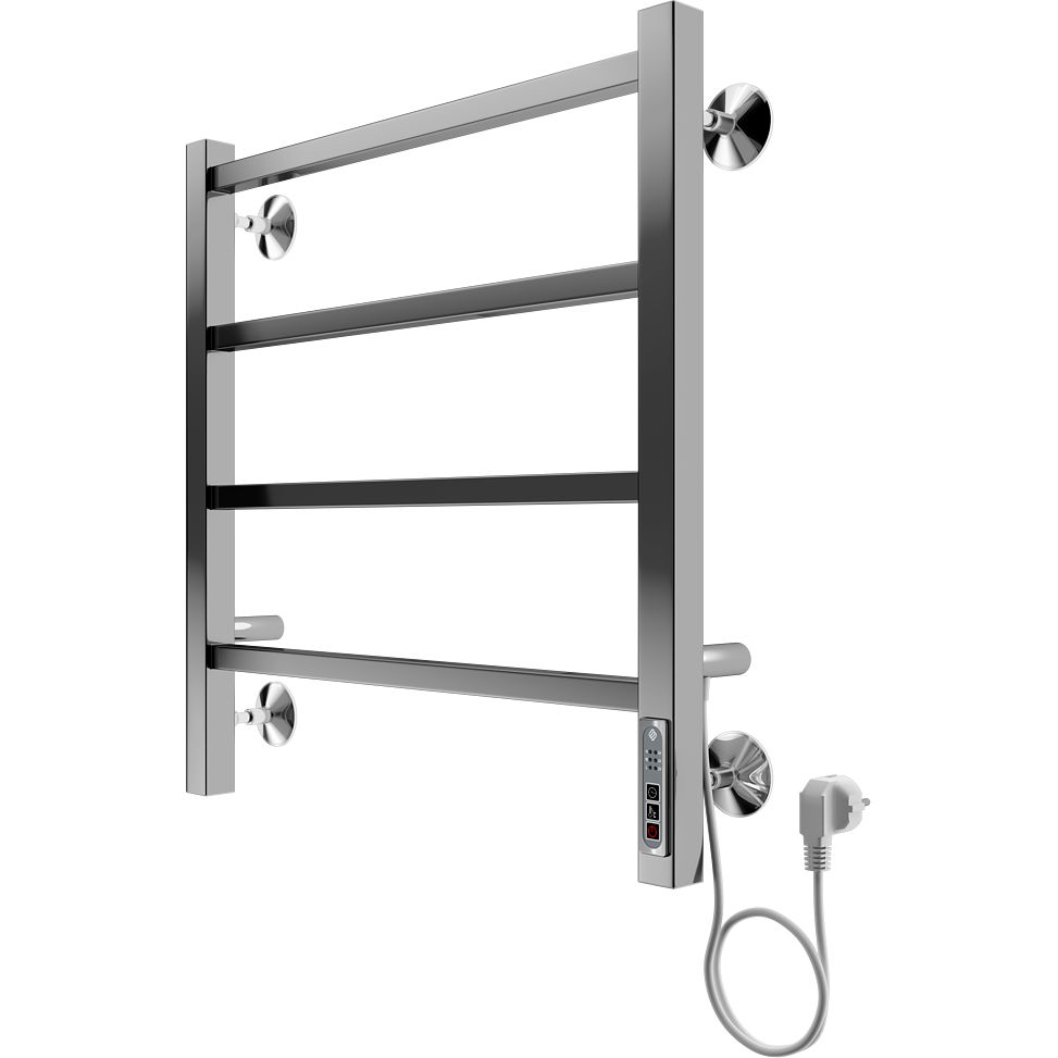 Полотенцесушитель выполнен из прочной нержавеющей стали и обладает размерами 53x55 см. Выпускается с мощностью 131 Вт, что позволяет эффективно обогревать площадь до 1.5 м2. Он оснащен нагревательным кабелем сухого типа и подключается к электрической сети либо через кабель с вилкой, либо скрытым способом в стене, что позволяет адаптировать установку под ваши нужды. Модель имеет возможность подключения как справа, так и слева. Управление устройством осуществляется с помощью выключателя на корпусе, терморегулятора и таймера.