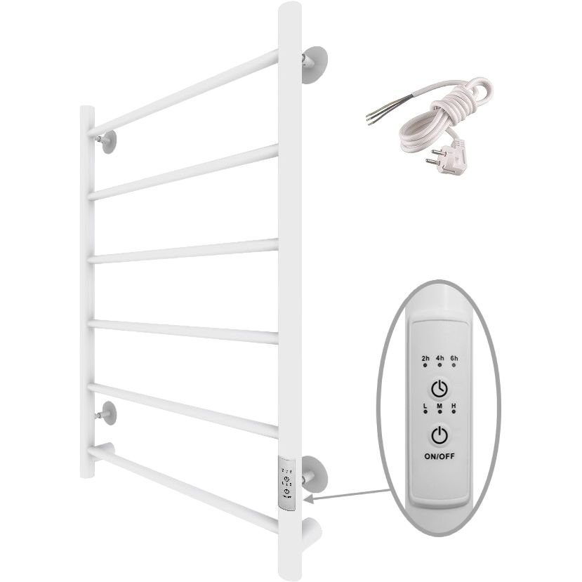 Данный полотенцесушитель обладает размерами 45,5x80 см и мощностью 60 Вт, что позволяет эффективно обогревать площадь до 2,86 м². Устройство оснащено встроенным терморегулятором, что позволяет устанавливать комфортную температуру нагрева, и выключателем на корпусе для быстрого отключения. Удобный таймер обеспечивает автоматическое выключение по окончании сушки, что поможет сэкономить электроэнергию. Полотенцесушитель поддерживает как правое, так и левое подключение к сети, а также может быть подключен через кабель с вилкой или скрыто в стене. Конструкция выполнена из трубы с электросварным швом, предназначенной для подвесного монтажа.
