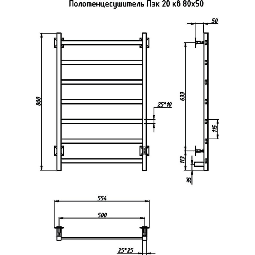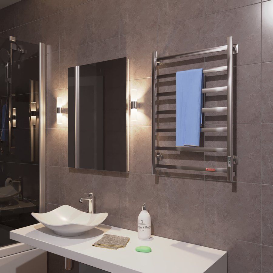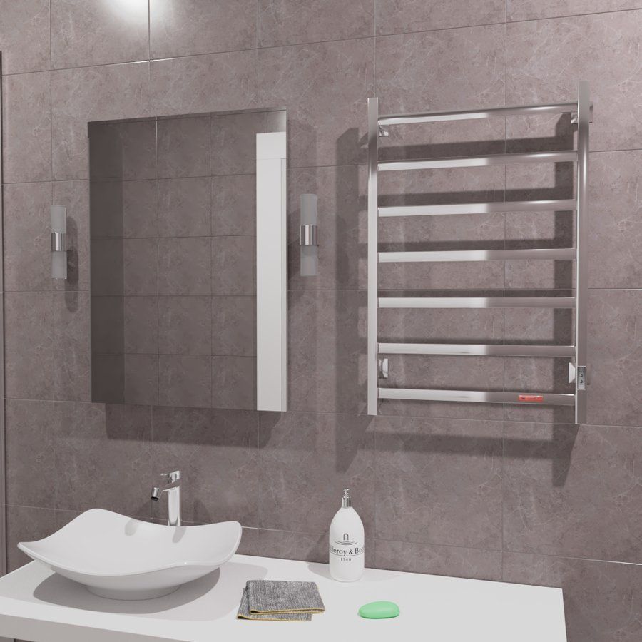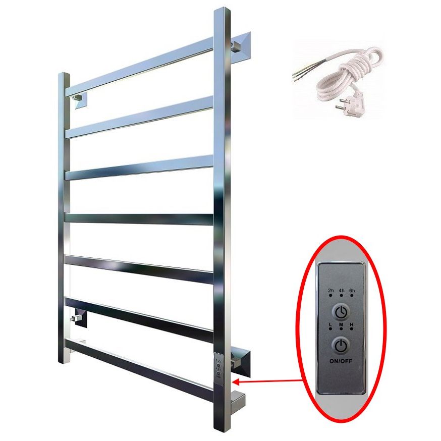 Полотенцесушитель имеет габариты 55,4x80 см и подключается к электрической сети при помощи кабеля с вилкой. Его мощность составляет 60 Вт, что достаточно для обогрева площади 3.67 м². Оснащён встроенным терморегулятором и таймером, он позволяет регулировать температуру и выключать устройство по окончании сушки. Изделие подвесного типа с паяными трубами удобно в установке и эксплуатации, а электрический кабель обеспечивает простое подключение. Предоставляется гарантия на 1 год.