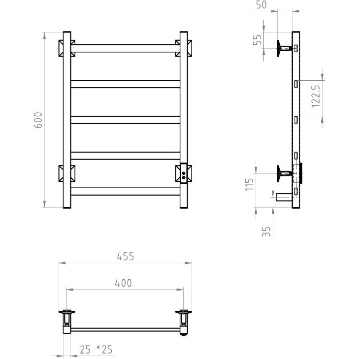 Полотенцесушитель имеет габариты 45,5x60 см и подвесную конструкцию. Он подключается к электрической сети через кабель с вилкой или может быть скрыт в стене. Мощность устройства составляет 60 Вт, что обеспечивает обогрев площади до 2.59 м2. Встроенный выключатель и световой индикатор упрощают управление. Нагревательный кабель размещен внутри трубы с электросварным швом, а таймер позволяет отключать устройство через 2, 4 или 6 часов. Гарантия составляет 1 год, производство — Россия.