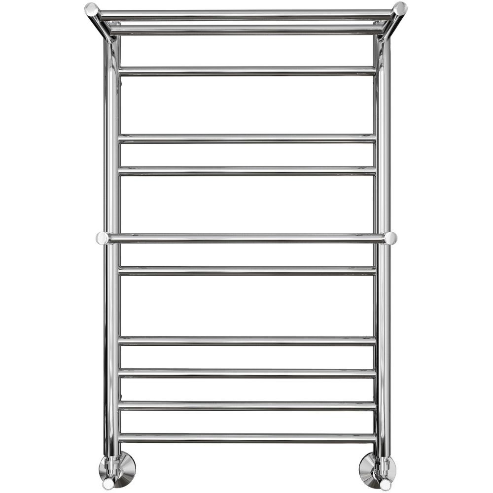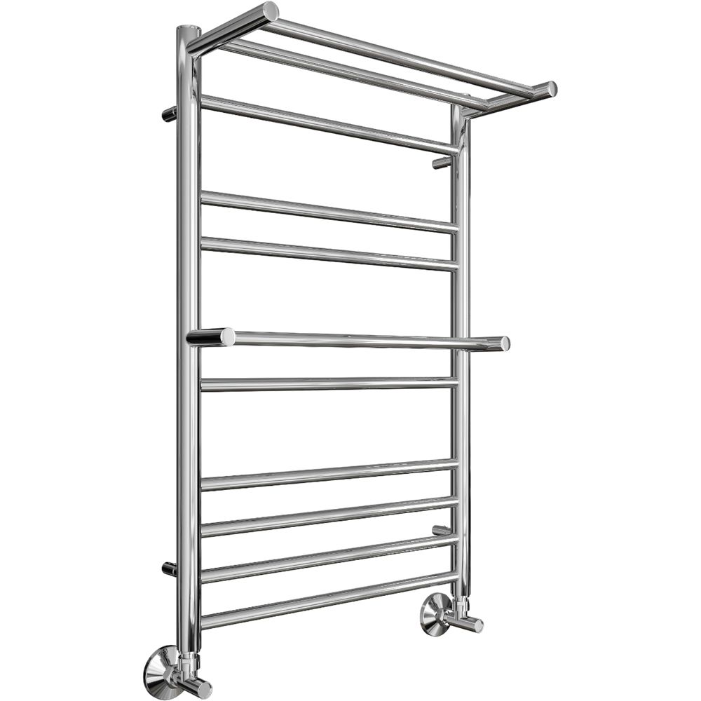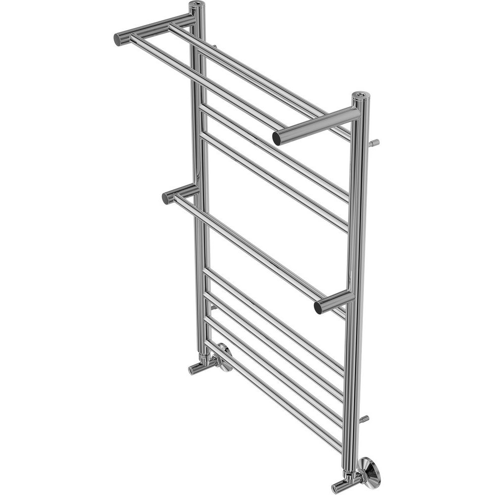 Полотенцесушитель размером 53x80 см представлен в элегантной хромированной отделке. Круглые профили ребер диаметром 18 мм гармонично сочетаются с вертикальными стойками 32 мм в диаметре. С полкой, что добавляет удобства в использовании. Подвесной тип монтажа позволяет сохранить пространство в ванной комнате. Приспособлен для горизонтального или диагонального подключения с межосевым расстоянием 50 см.