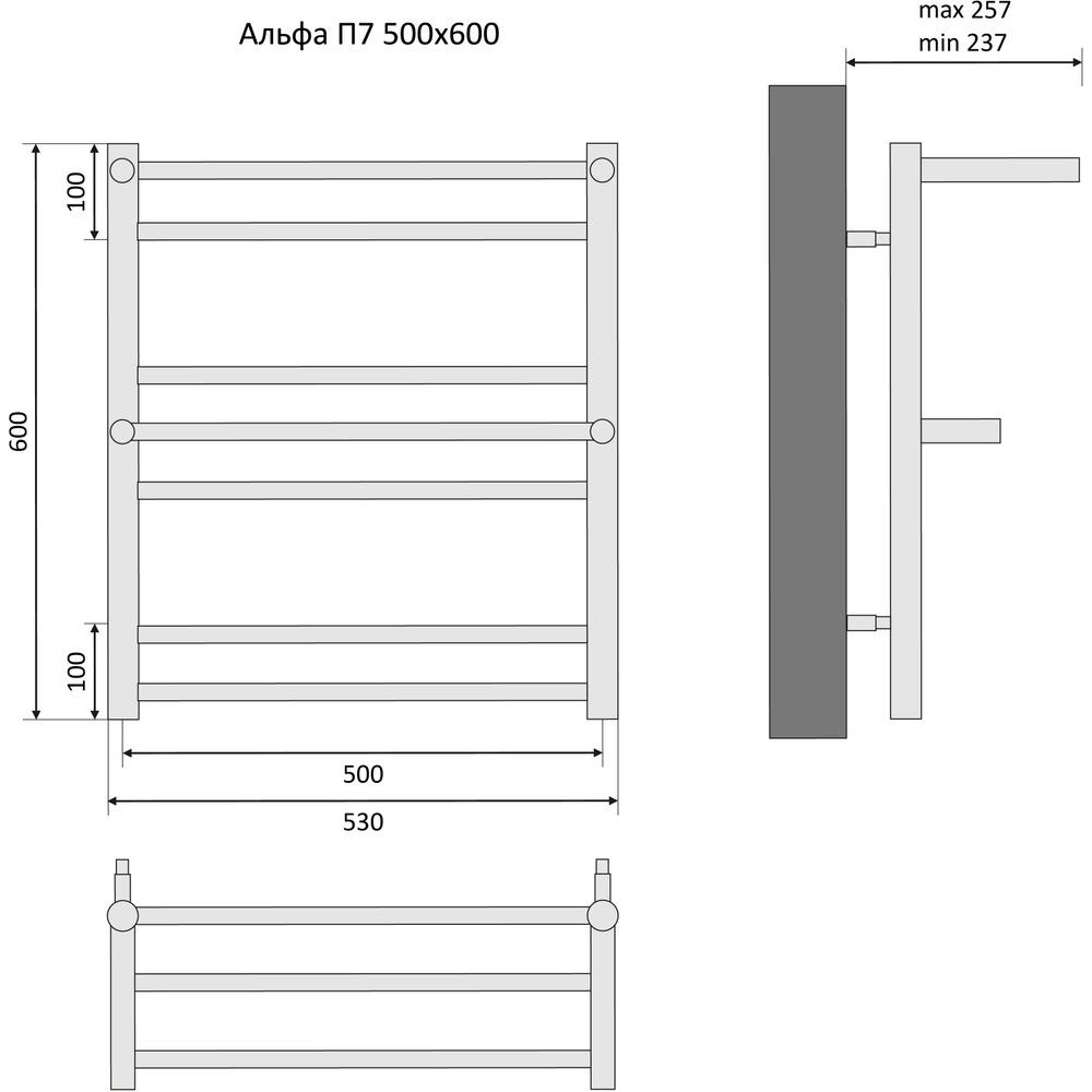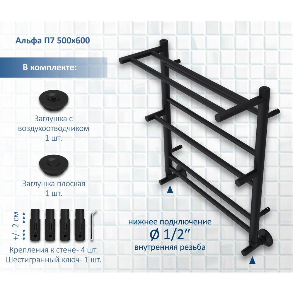 Полотенцесушитель Акватек Альфа П7 имеет ширину 53 см и высоту 60 см. Он оснащен полкой для дополнительного удобства. Площадь обогрева составляет 3 м2, что позволяет эффективно использовать его в ванной комнате любого размера. Подключение возможно как горизонтально, так и диагонально, учитывая межосевое расстояние в 50 см. Комплект креплений идет в комплекте, однако декоративные отражатели необходимо приобретать отдельно.