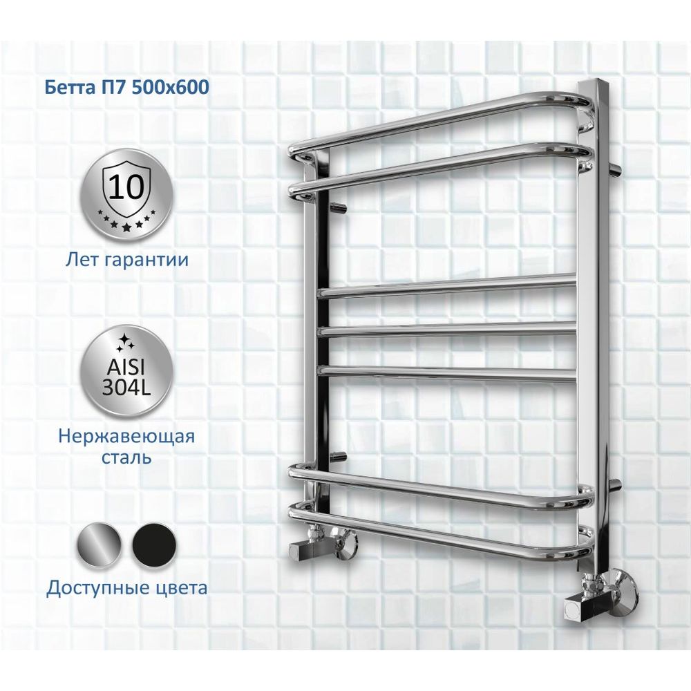 Полотенцесушитель водяной "Акватек Бетта П7 50x60 хром" прекрасно впишется в интерьер вашей ванной комнаты, обеспечивая эффективный обогрев и комфорт. Созданный с использованием лазерной сварки из нержавеющей стали, он отличается прочностью и долговечностью. Изделие имеет элегантный и современный дизайн благодаря круглым ребрам диаметром 18 мм и квадратным вертикальным стойкам размером 30х30 мм.