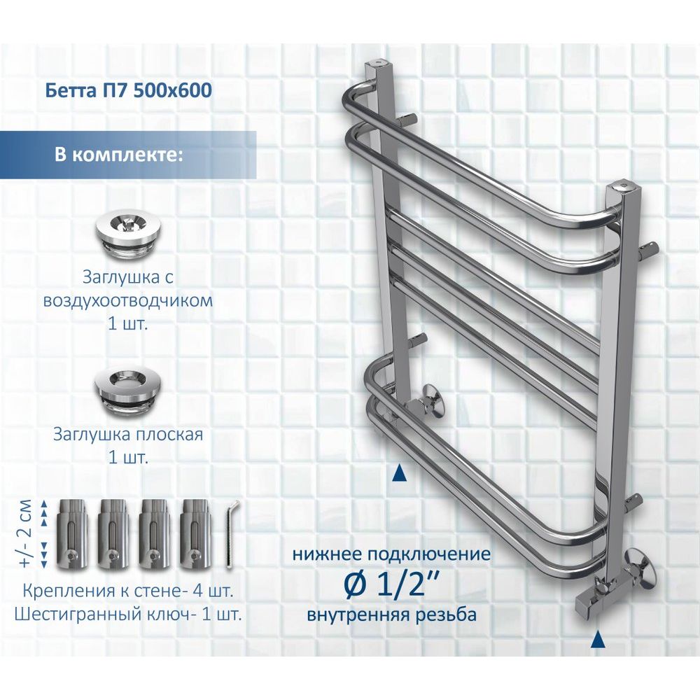 Для полноценного использования полотенцесушителя необходимо отдельно приобрести комплект вентилей или угловых соединений со сгоном, а также декоративные отражатели, так как они не входят в комплект. Убедитесь, что эти дополнительные элементы подходят для запланированной установки, чтобы избежать сложностей.
