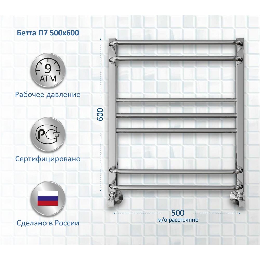 Ширина полотенцесушителя составляет 53 см, а высота — 60 см, что позволяет ему эффективно обогревать площадь до 3 м². Он подвесной и поставляется с креплениями, но требует дополнительной покупки отражателей. Изготовлен в России, отличается качественной лазерной сваркой для надежного использования на протяжении многих лет.