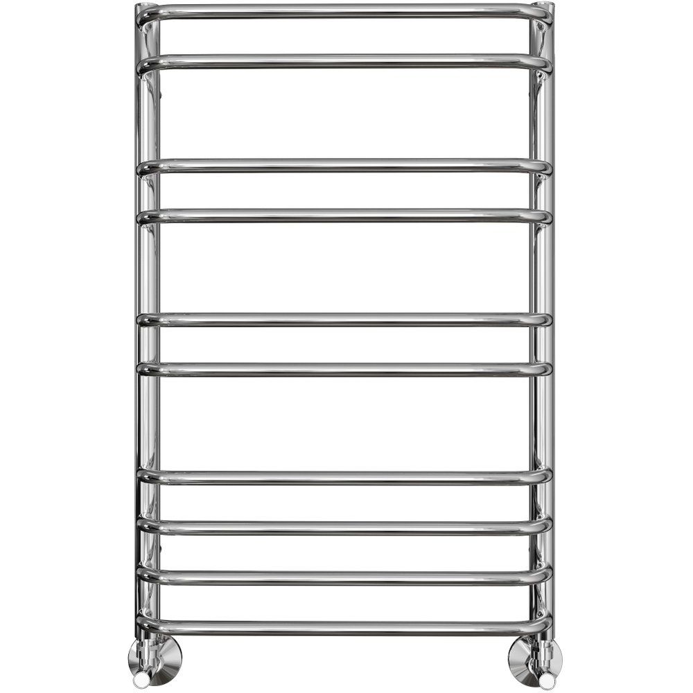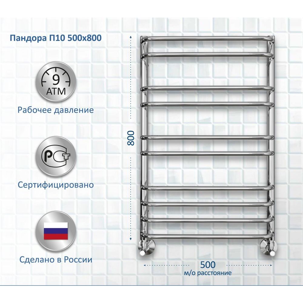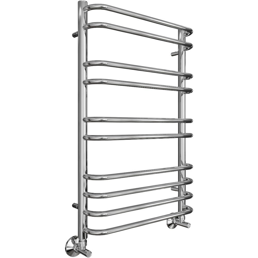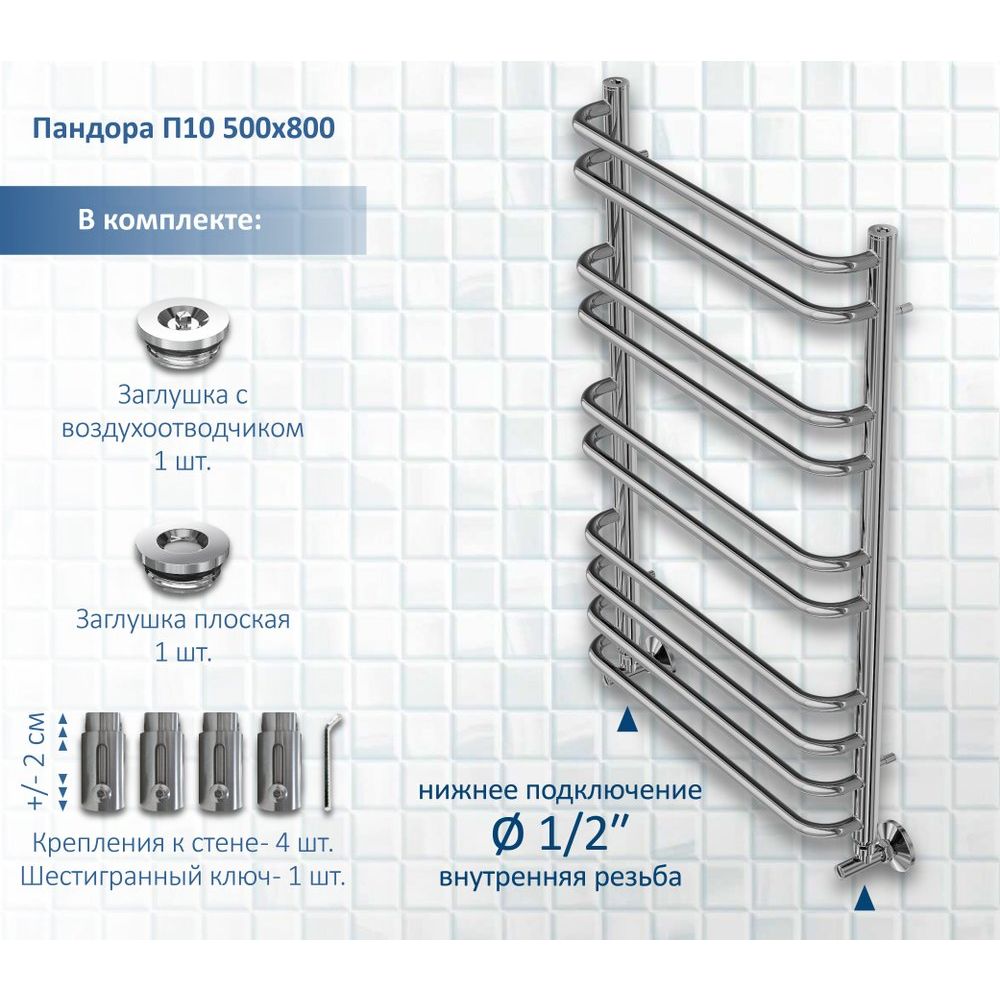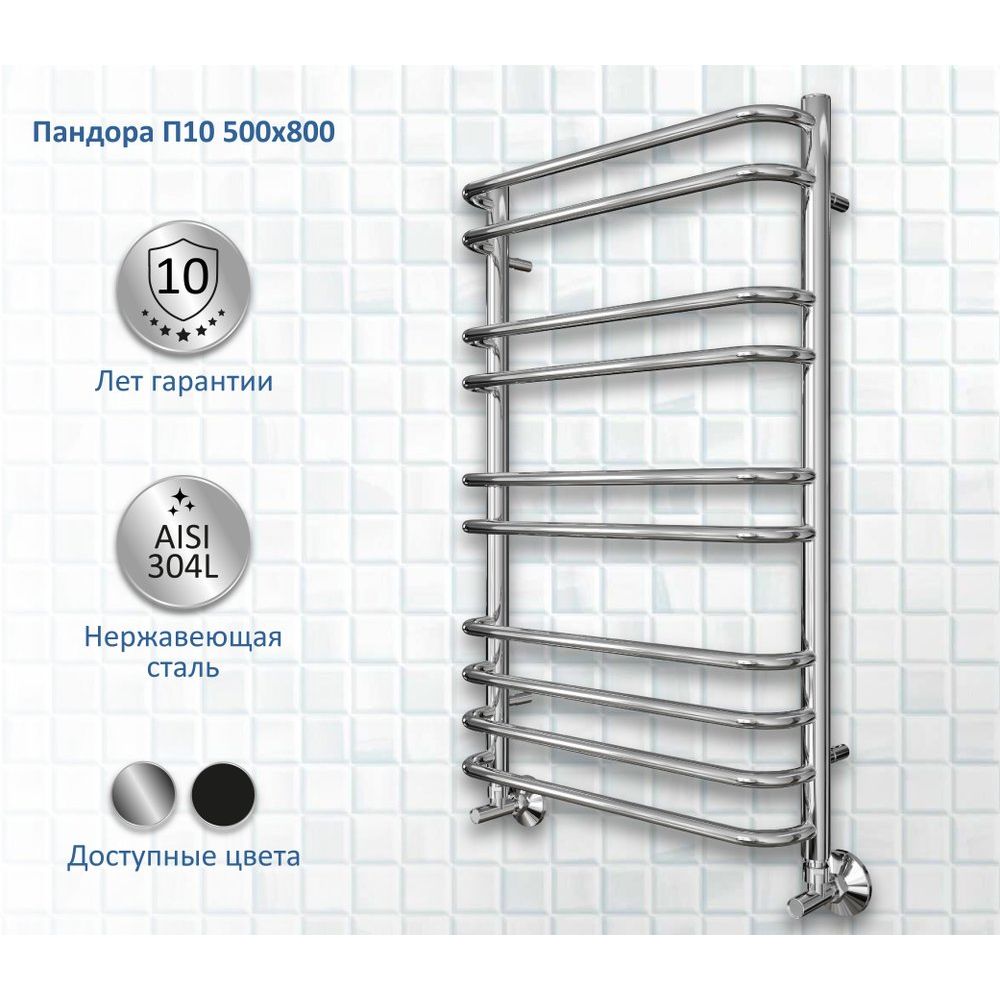 Полотенцесушитель водяной Акватек Пандора П10 50x80 хром — это стильное решение для вашей ванной комнаты, совмещающее в себе функциональность и современный дизайн. Его элегантный хромированный верх покрывает надежную нержавеющую сталь, обеспечивая долговечность и устойчивость к коррозии. Простой и изящный профиль круглых ребер диаметром 18 мм и вертикальных стоек 30 мм придает изделию утонченный вид и гармонично сочетается с любым интерьером.