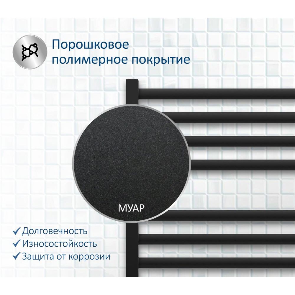 Водяной полотенцесушитель Акватек Поларис П16 50x110 в выразительном черном муаре — это стильное и функциональное дополнение для вашей ванной комнаты. Уникальный дизайн изделия, с профилем ребер в виде овала и квадратными вертикальными стойками, обеспечивает не только эффективное высушивание полотенец, но и становится ярким акцентом в интерьере. Модель легко справляется с обогревом площадью до 4,7 м2, что делает ее отличным выбором для современных ванных комнат.