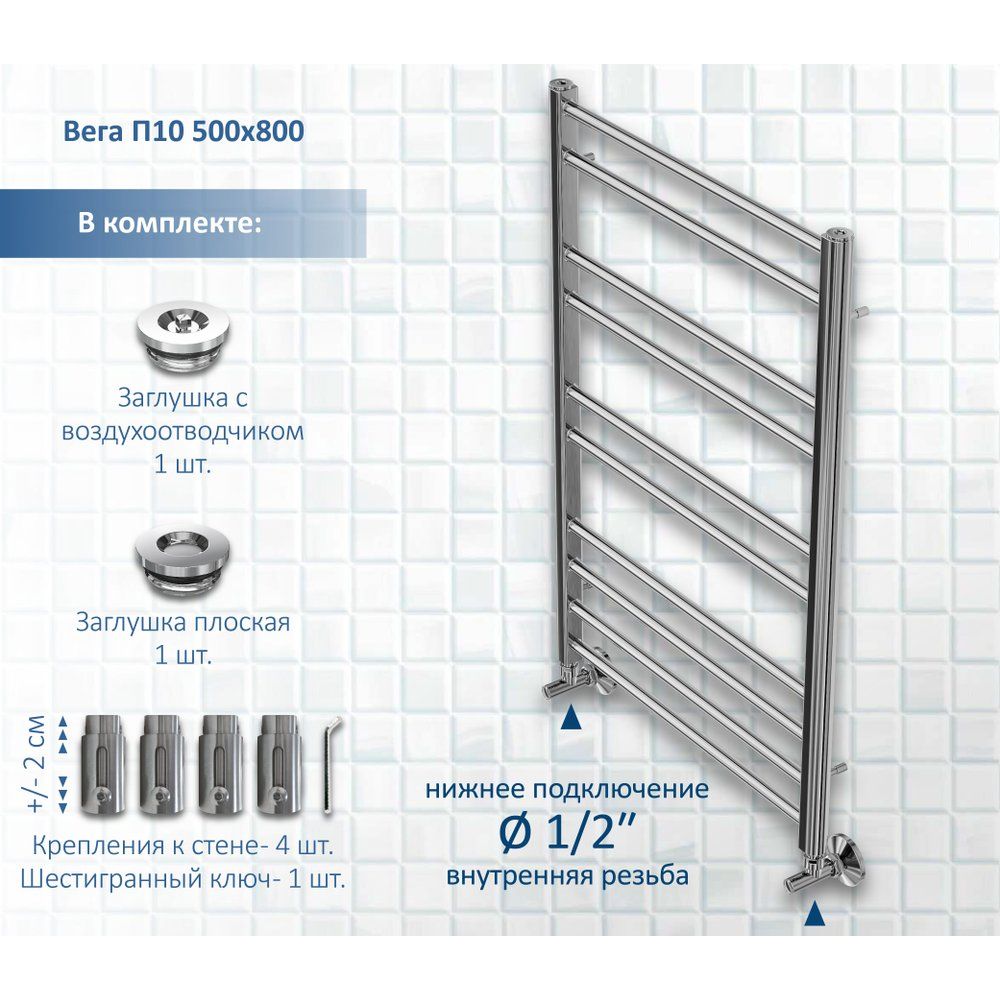 Полотенцесушитель обладает размерами 53x80 см, что позволяет ему легко вписаться в интерьер вашей ванной комнаты. Межосевое расстояние составляет 50 см, что упрощает процесс установки. Изделие крепится с помощью подвесных крепежей и имеет лазерную сварку, обеспечивая максимальную прочность конструкций. Система подключения позволяет установить устройство как горизонтально, так и диагонально, что добавляет дополнительную гибкость при монтаже.