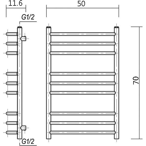 Габариты полотенцесушителя составляют 50x70 см, что оптимально подходит для различных площадей. Его мощность равняется 264 Вт, что позволяет эффективно обогревать площадь до 2.64 м². Межосевое расстояние — 50 см, а само устройство подключается горизонтально. Для его производства используется труба с электросварным швом, что обеспечивает дополнительную прочность и герметичность устройства. Полотенцесушитель подвесной, и оснащен краном Маевского для удаления воздуха из системы. Гарантия на изделие составляет 3 года, подтверждая качество российской сборки.