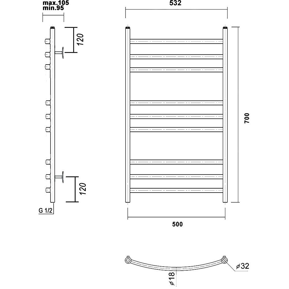 Этот полотенцесушитель имеет размеры 53,2 x 70 см и рассчитан на обогрев площади до 2.64 м². Он оснащён краном Маевского, что позволяет удалять воздух из системы, а также приходит с креплениями. Межосевое расстояние составляет 50 см, что оптимально для стандартной установки. Изделие подвесное, выполнено из прочной нержавеющей стали, одного из самых надёжных материалов.