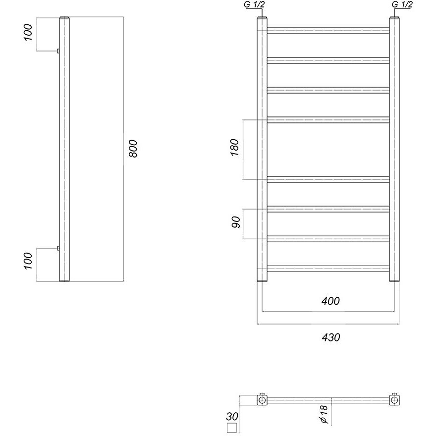 Полотенцесушитель имеет размеры 43x80 см и межосевое расстояние 40 см, что оптимально подходит для стандартных ванных комнат. Он оснащен отражателями и краном Маевского для удобного удаления воздуха из системы, обеспечивая эффективное функционирование. Подключение выполняется горизонтально, что обеспечивает простоту и быстроту установки. Полотенцесушитель рассчитан на обогрев площади до 2.86 м².