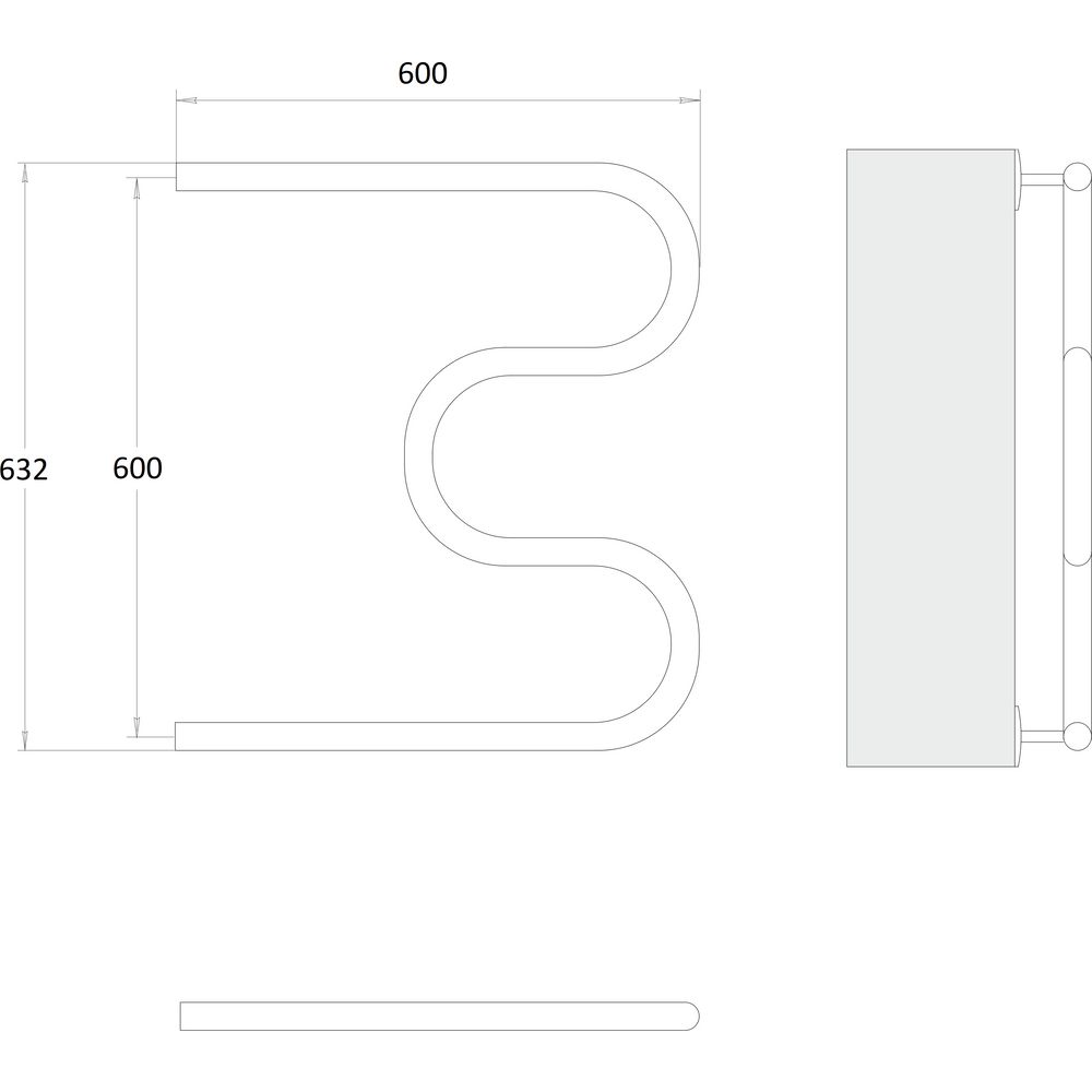 Полотенцесушитель имеет размеры 60x63,2 см и межосевое расстояние 60 см, обеспечивая удобное вертикальное подключение с подачей воды сверху и выпуском потока снизу. Прочная конструкция из бесшовной цельнотянутой трубы обеспечивает надежность и эстетичный вид.