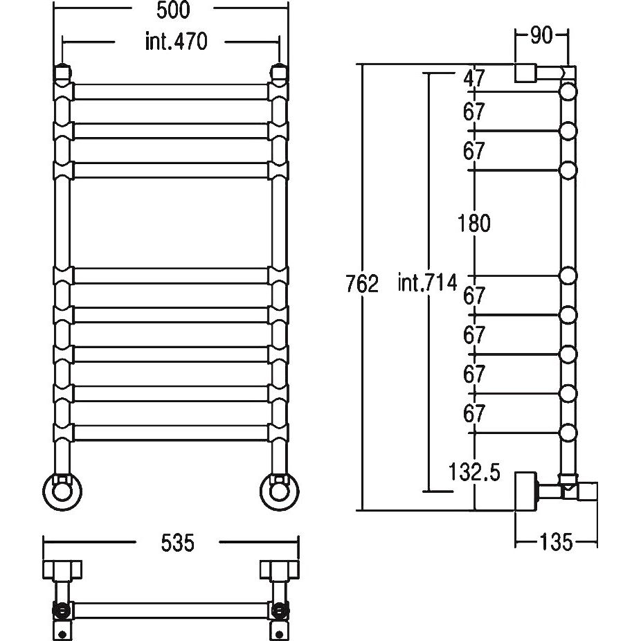 Полотенцесушитель Margaroli Sole 464-8 имеет размеры 53,5x76,2 см, а межосевое расстояние составляет 47 см. Устройство устанавливается подвесным способом с горизонтальным направлением подключения. Подключение осуществляется через внешнюю резьбу 1/2, выдерживая допустимую температуру воды до 110 °С и максимальное рабочее давление в 15 атмосфер. Для надежного монтажа в комплект входят крепления.