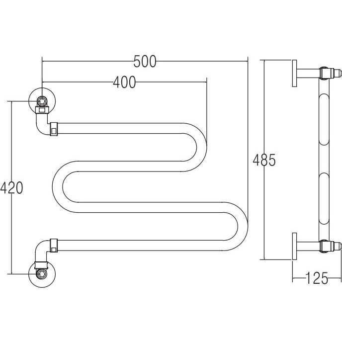 Размеры полотенцесушителя составляют ширину 50 см и высоту 48,5 см, с межосевым расстоянием 42 см, что позволяет рационально использовать пространство. Трубы с внешним резьбовым подключением 1/2 дюйма обеспечивают надежную подводку воды. Изделие выдерживает температуру воды до 110 °С и максимальное рабочее давление 15 атмосфер, что подтверждает его прочность и надежность. Конструкция предназначена для вертикального подключения с подачей воды сверху и выпуском снизу.