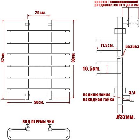 Полотенцесушитель имеет размеры 50х82 см и межосевое расстояние 20 см, что подходит для обогрева площади до 7 м2. Его теплоотдача составляет 335 Вт. Сушитель оснащен внутренней резьбой 1/2, что упрощает его установку.