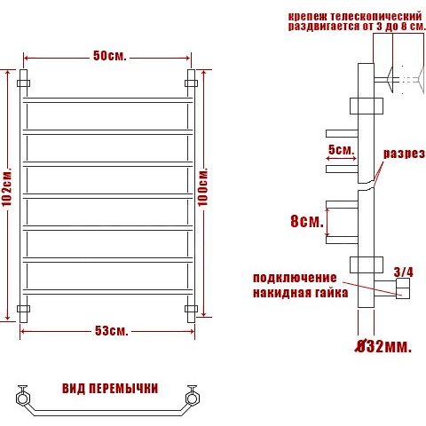 Полотенцесушитель Ника Trapezium ЛТ 100/50-7 имеет габариты 53x102 см и межосевое расстояние 50 см, что делает его подходящим для разных интерьеров ванной комнаты. Сопротивляется коррозии благодаря толщине стенок трубы в 2 мм и диаметру основной трубы 25 мм. Оснащен отражателями и краном Маевского для удаления воздуха из системы, а также креплениями для легкой установки. Может обогреть до 9.5 м² пространства с гибкими вариантами подключения — горизонтальное, вертикальное, или диагональное, с подачей воды сверху и выпуском снизу.