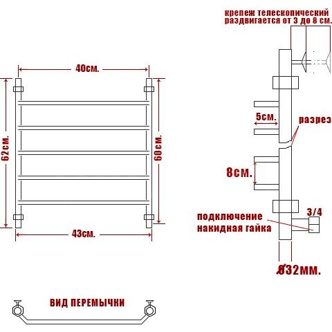 Полотенцесушитель имеет компактные размеры 43x62 см и межосевое расстояние 40 см, что позволяет устанавливать его даже в небольших помещениях. Толщина стенок труб составляет 2 мм, а диаметр основной трубы — 25 мм, что создает надежную конструкцию. Перемычка диаметром 1/2 дюйма и внутренняя резьба 1/2 дюйма обеспечивают устойчивость к высоким давлениям. Дополнительно прибор оснащён отражателями и креплениями, а также функциональным краном Маевского.