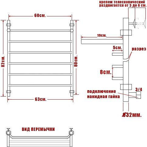 Полотенцесушитель Ника Trapezium оснащен полкой и имеет габариты 63x82 см. Он выполнен из нержавеющей стали, с толщиной стенок труб 2 мм и диаметром основной трубы 25 мм. Перемычки имеют диаметр 1/2 дюйма с внутренней резьбой той же величины. Комплектуется отражателями и краном Маевского, для удаления воздуха из системы, а также надежными креплениями. На устройство предоставляется 5-летняя гарантия.