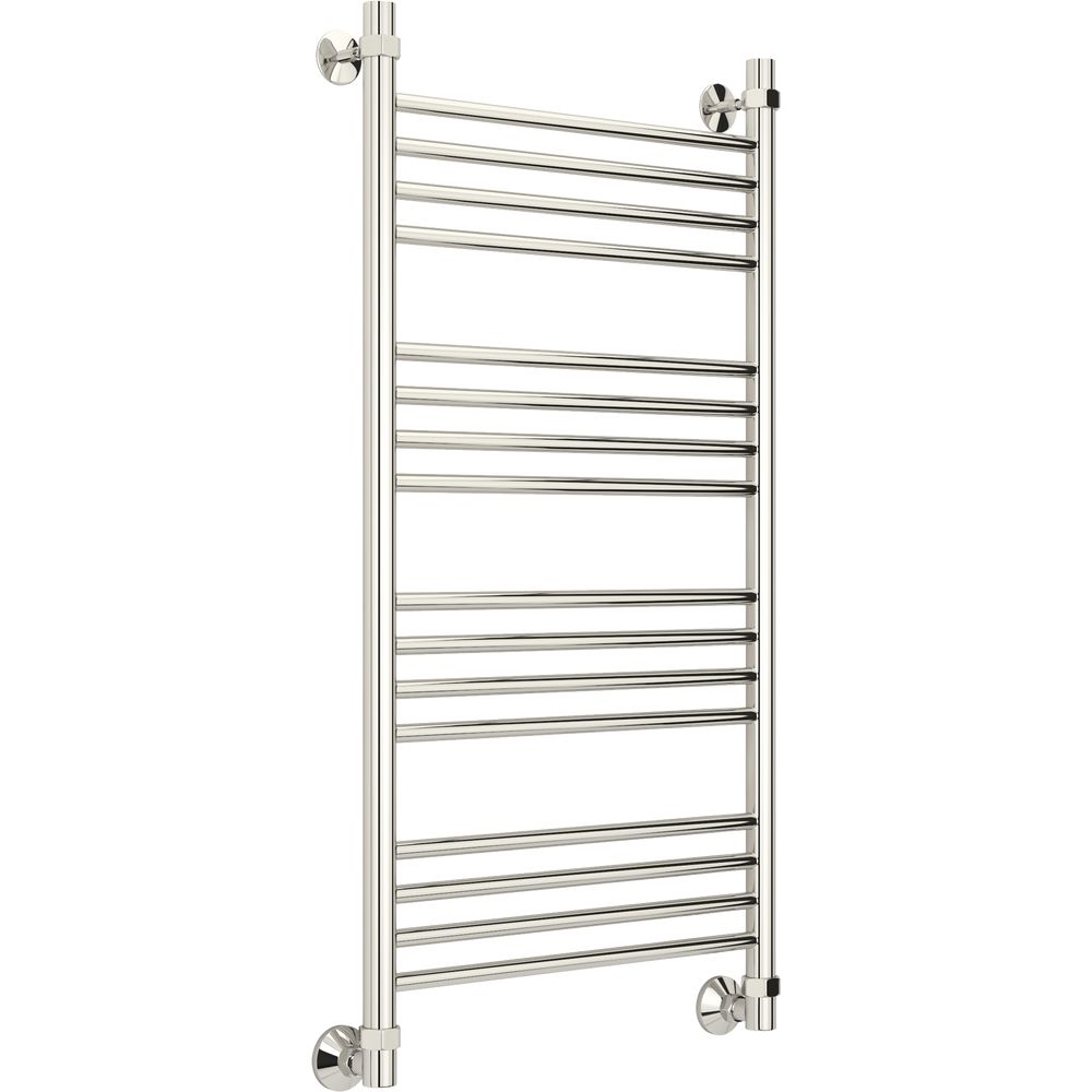 Этот полотенцесушитель представляет собой подвесную конструкцию с размерами 56,5 на 104,2 см. Имеет межосевое расстояние 100 и 50 см, что обеспечивает его совместимость с различными системами отопления. Возможны три варианта направления подключения: горизонтальное, вертикальное с подачей воды сверху и выпуск потока снизу, а также диагональное подключение. Устройство использует трубу с электросварным швом, что гарантирует прочность и надежность конструкции.