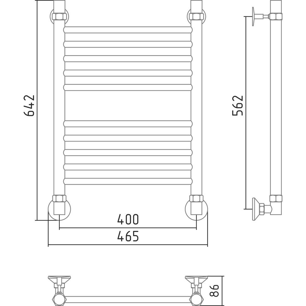 Габариты полотенцесушителя составляют 46,5x64,2 см, что обеспечивает оптимальную площадь для сушки полотенец и обогрева помещения. Межосевое расстояние варьируется между 60 и 40 см, предоставляя варианты горизонтального и вертикального подключения. Подача воды осуществляется сверху, а выпуск потока снизу, с возможностью диагонального подключения, позволяя гибкость установки. Изделие выполнено из трубы с электросварным швом, что увеличивает прочность и надежность конструкции. Для удобства эксплуатации полотенцесушитель оснащен отражателями, краном Маевского для удаления воздуха из системы, а также муфтой и накидной гайкой.