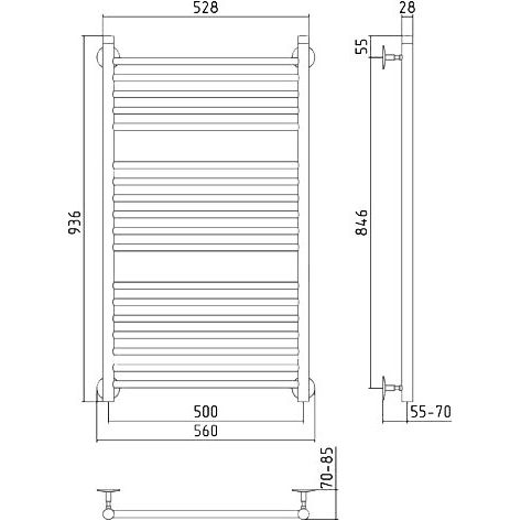 Полотенцесушитель выполнен из нержавеющей стали и имеет размеры 56x93,6 см с межосевым расстоянием в 50 см. Для подключения предусмотрено горизонтальное направление. Кран Маевского облегчает удаление воздуха из системы, что улучшает прогрев. Устройство подвесное и предлагается с пятилетней гарантией, чтобы вы были уверены в его надежности и долговечности.