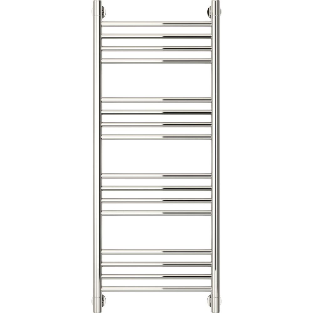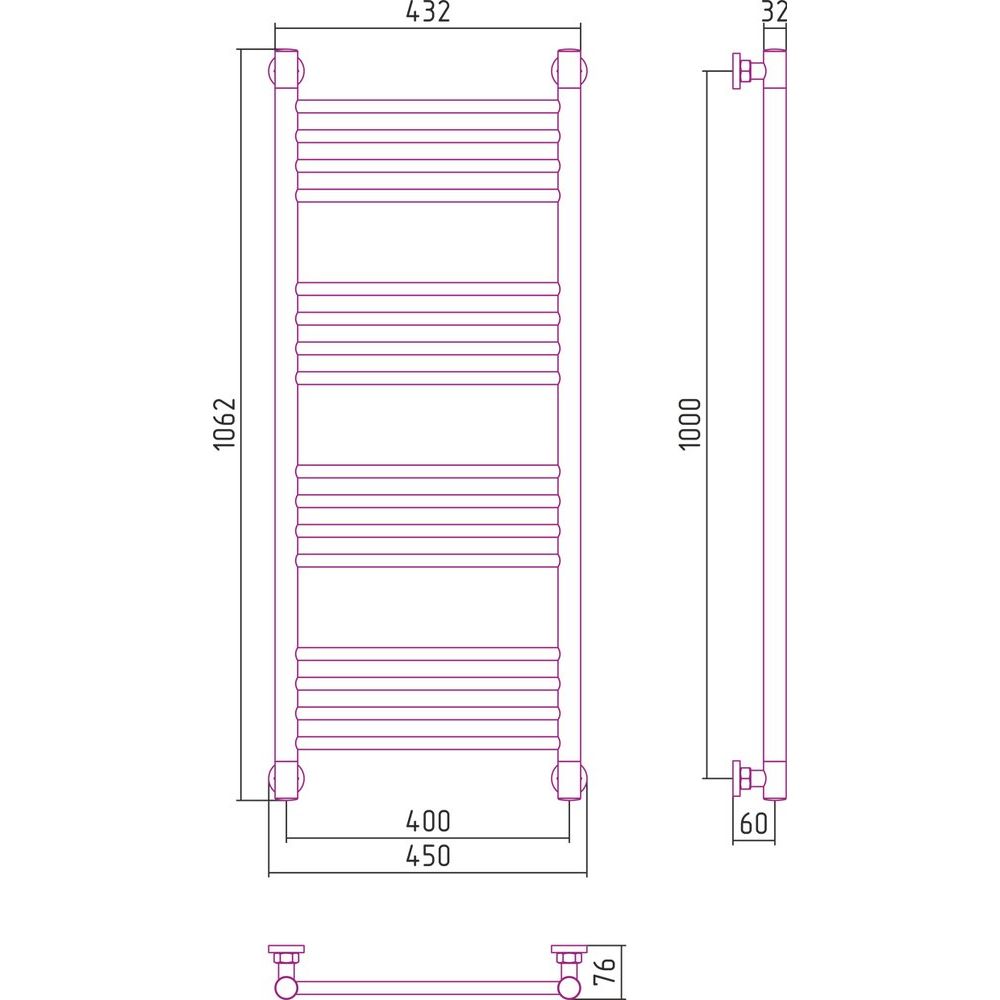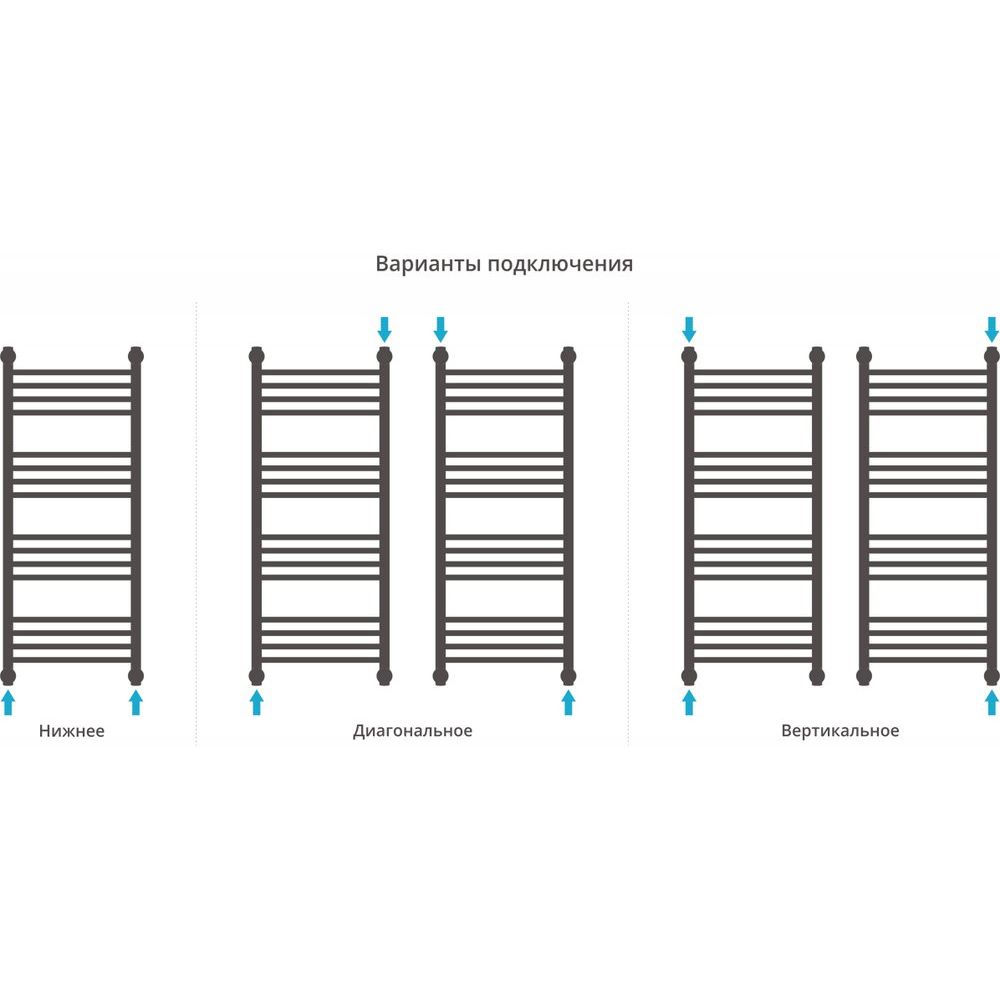Полотенцесушитель имеет размеры 45x106,2 см, что позволяет ему эффективно вписаться даже в компактное пространство. Модель предусматривает различные варианты подключения: горизонтальное, вертикальное или диагональное, с подачей воды сверху и нижним выпуском. Система защищена от протечек, minimizируя риск затопления. Для надежного монтажа в комплект входят крепления и накидная гайка. Устройство укомплектовано заглушками-отражателями и краном Маевского, обеспечивающим надежность нагрева и легкую эксплуатацию.