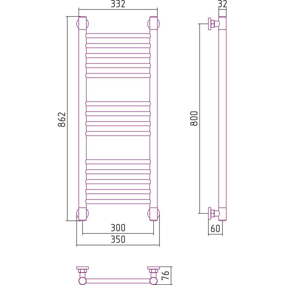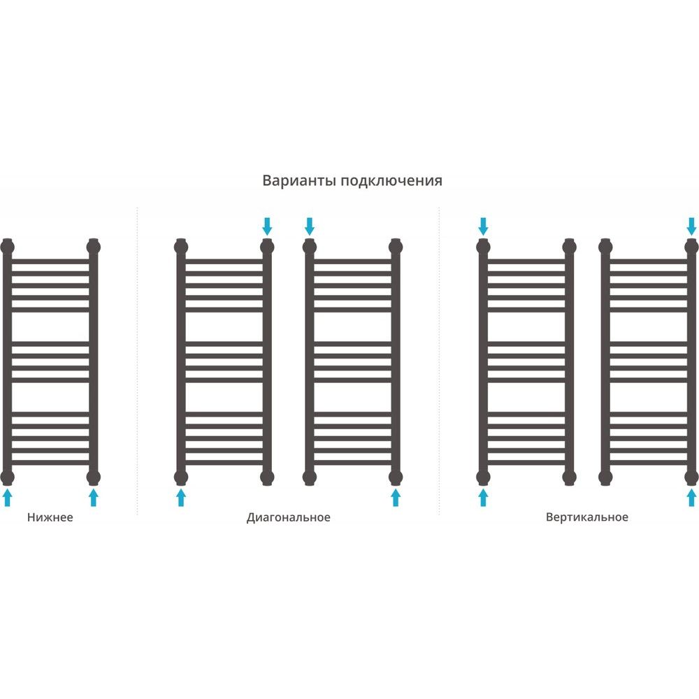 Полотенцесушитель имеет размеры 35x86,2 см и межосевое расстояние 80/30 см, что делает его компактным и одновременно эффективным элементом для ванной. Особенностью конструкции является способность к различным способам подключения: горизонтальное, вертикальное с подачей воды сверху и выпуском снизу, или диагональное. Эта универсальность позволяет легко интегрировать его в вашу систему отопления.