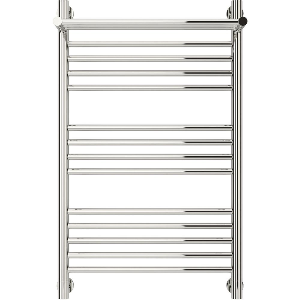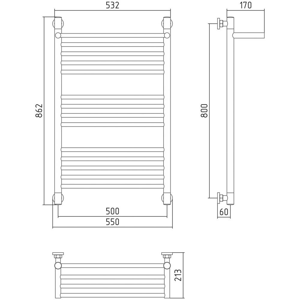 Полотенцесушитель имеет габариты 55x86,2 см и оснащен удобной полкой для дополнительного хранения. Изделие поддерживает три типа подключения, что облегчает монтаж — горизонтальное, вертикальное и диагональное, с межосевыми расстояниями в 80 и 50 см в зависимости от направления. Спроектирован из долговечной нержавеющей стали с электросварным швом, что обеспечивает надежность и эстетику. В комплектации предусмотрены отражатели, кран Маевского для удаления воздуха из системы и крепления, облегчающие установку.