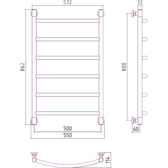 Полотенцесушитель имеет размеры 55x86,2 см, обеспечивая оптимальное использование пространства в ванной комнате. Межосевое расстояние составляет 80/50 см, что подходит для различных схем подключения: горизонтального, вертикального и диагонального, с подачей воды сверху и выпуском её снизу.