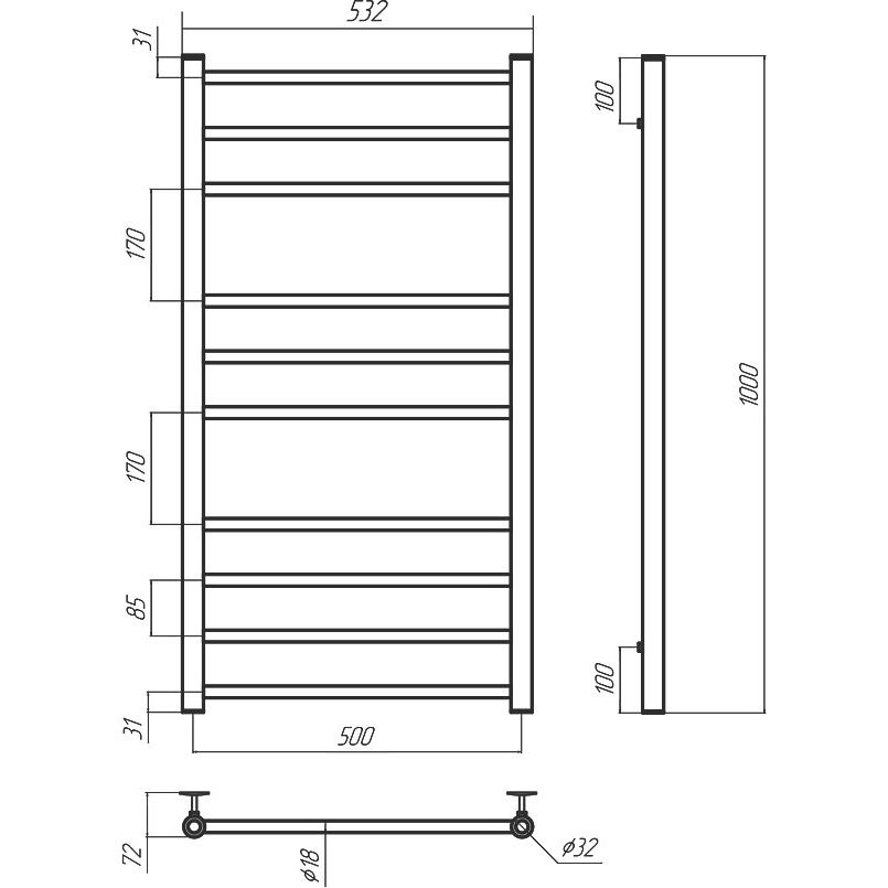 Полотенцесушитель имеет габариты 53,2x100 см и мощность 362 Вт, что позволяет эффективно обогревать пространство до 4 м². Межосевое расстояние в 50 см с подвесной конструкцией делают его удобным для большинства ванных комнат. Комплектуется краном Маевского, что упрощает процесс удаления воздуха из системы, обеспечивая стабильную работу. Крепления включены в комплект для быстрой и надежной установки.