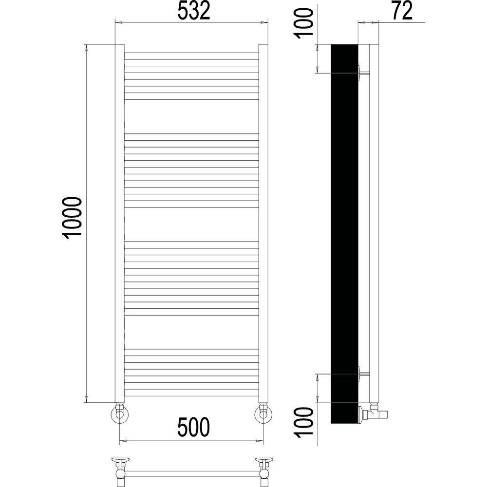 Полотенцесушитель имеет размеры 53,2 см в ширину и 100 см в высоту, с межосевым расстоянием в 50 см, что делает его подходящим для различных компоновок ванных комнат. Он подключается горизонтально, а наличие отражателей и креплений в комплекте упрощает установку. Устройство предназначено для подвесного монтажа, обеспечивая оптимальное использование пространства.