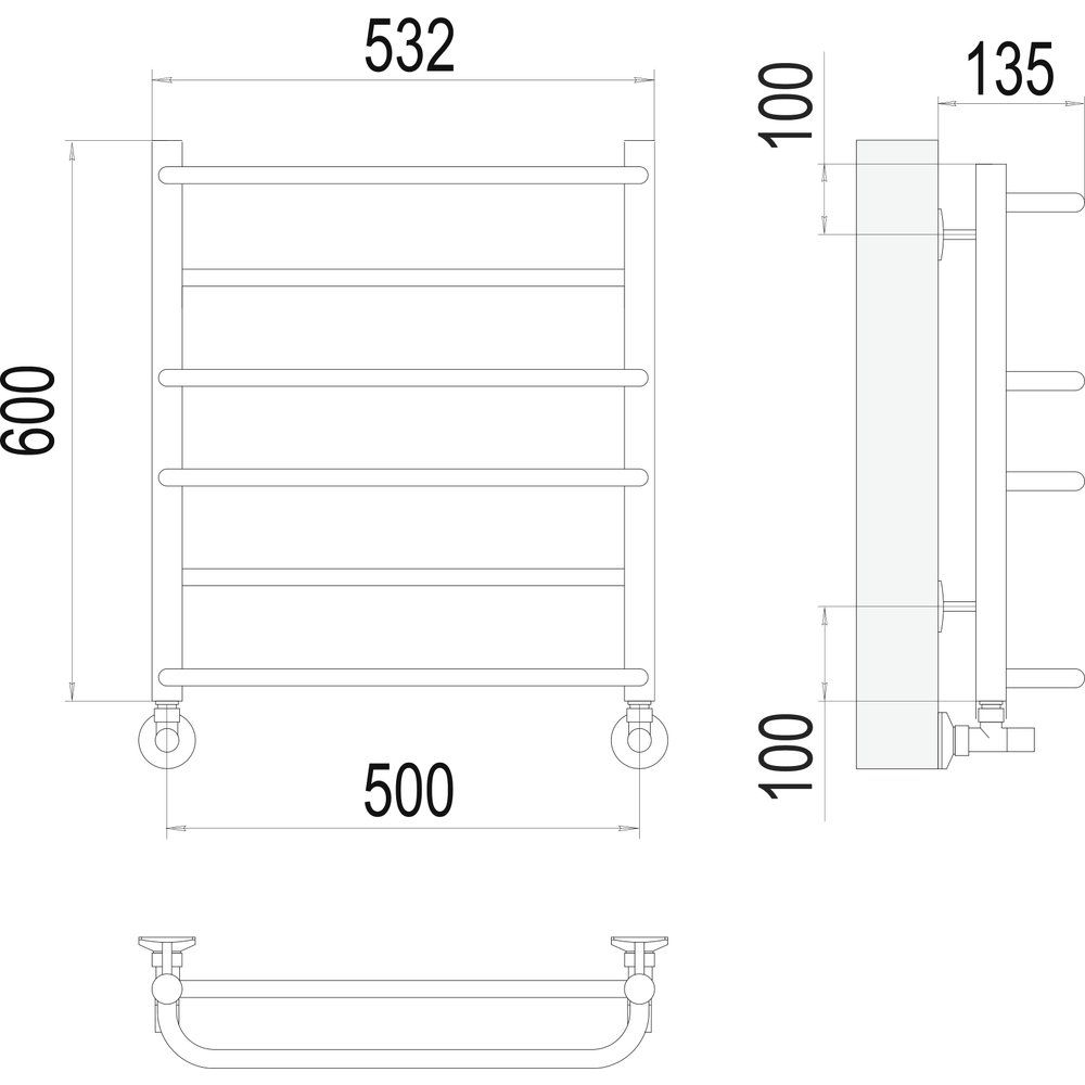 Полотенцесушитель имеет габариты 53,2x60 см и межосевое расстояние 50 см, что делает его подходящим для большинства ванных комнат. Теплоотдача составляет 213 Вт, обеспечивая эффективный обогрев вашей ванной. Устройство оснащено краном Маевского для устранения воздуха из системы и необходимыми креплениями. Подвесной тип монтажа с горизонтальным подключением обеспечивает удобство установки и использования.