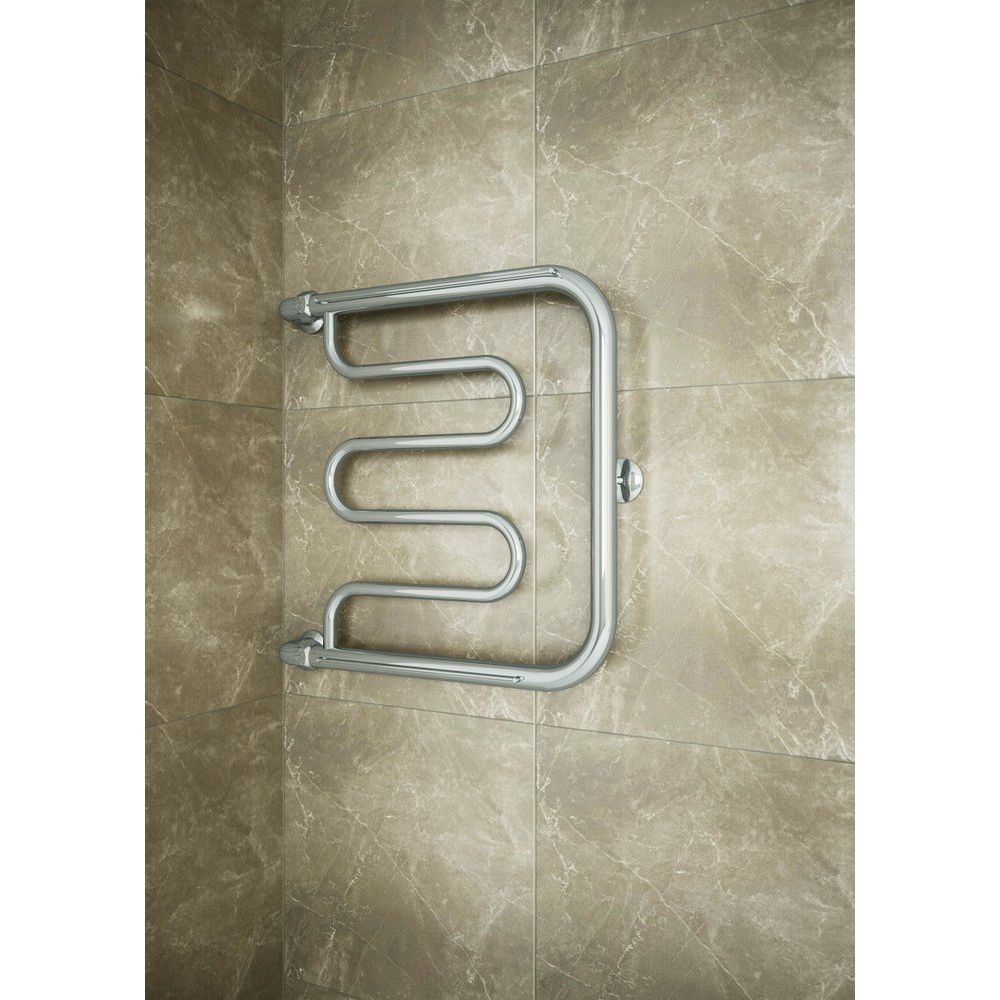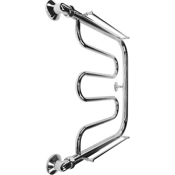 Полотенцесушитель имеет размеры 50x63,2 см с межосевым расстоянием 60 см. Подключается вертикально с подачей воды сверху и выпуском потока снизу. Он обеспечит комфортное отопление пространства площадью до 2.1 м². Конструкция выполнена из трубы с электросварным швом, обладая при этом подвесной установкой. Вместе с полотенцедержателем и креплениями, устройство идеально впишется в интерьер вашей ванной комнаты. Продукт производится в России и сопровождается гарантией на 10 лет.